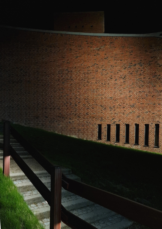 Using only 8 technical spots with varied optics, the lighting emphasizes scale, shape, colour, and material. All light sources are dimmed. The luminaires are focused so that the light is emitted at an oblique angle to the facade and caresses the surface like a painter’s brush stroke. The brightness decreases naturally as the distance between the light source and the wall surface increases.