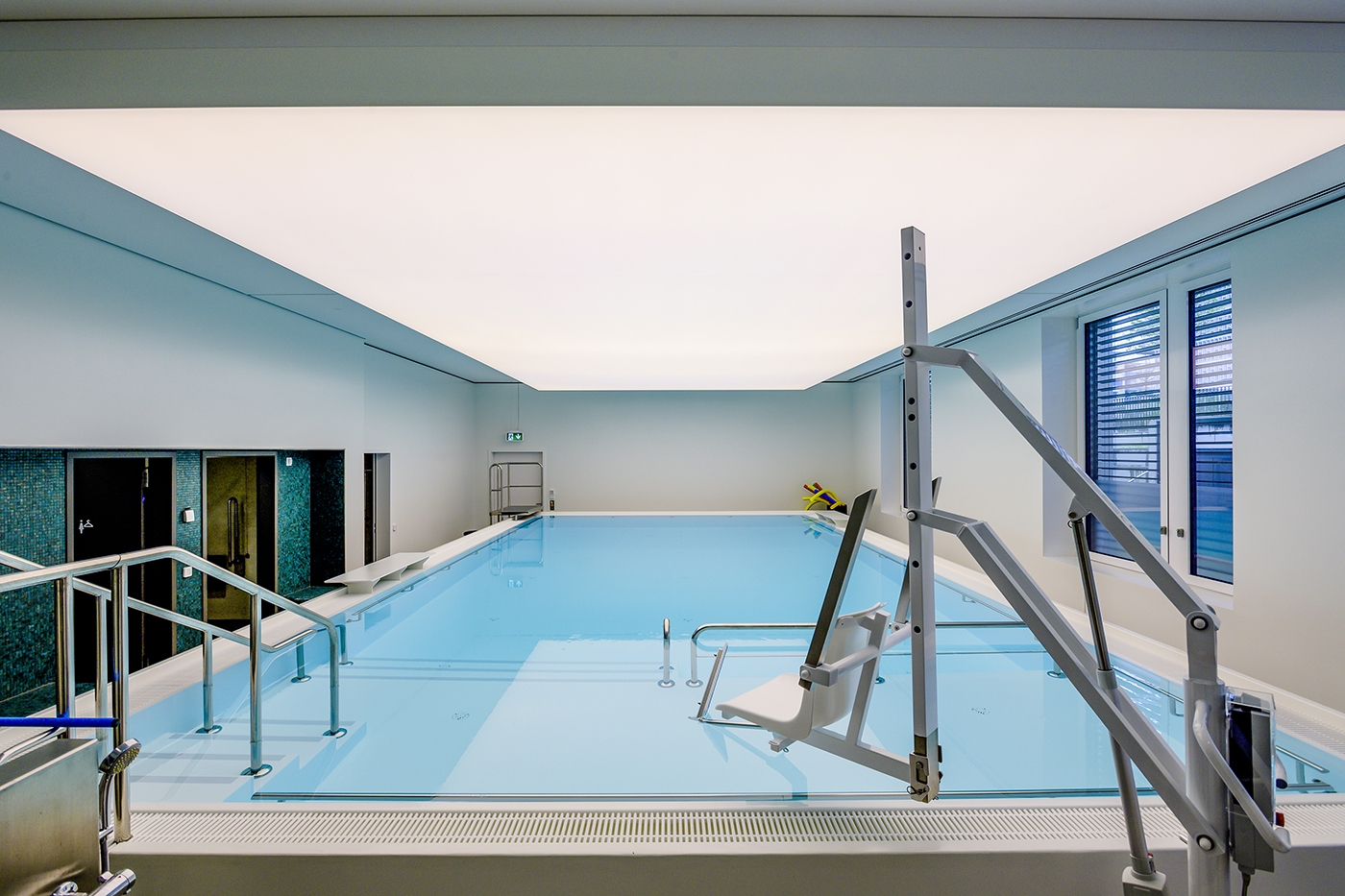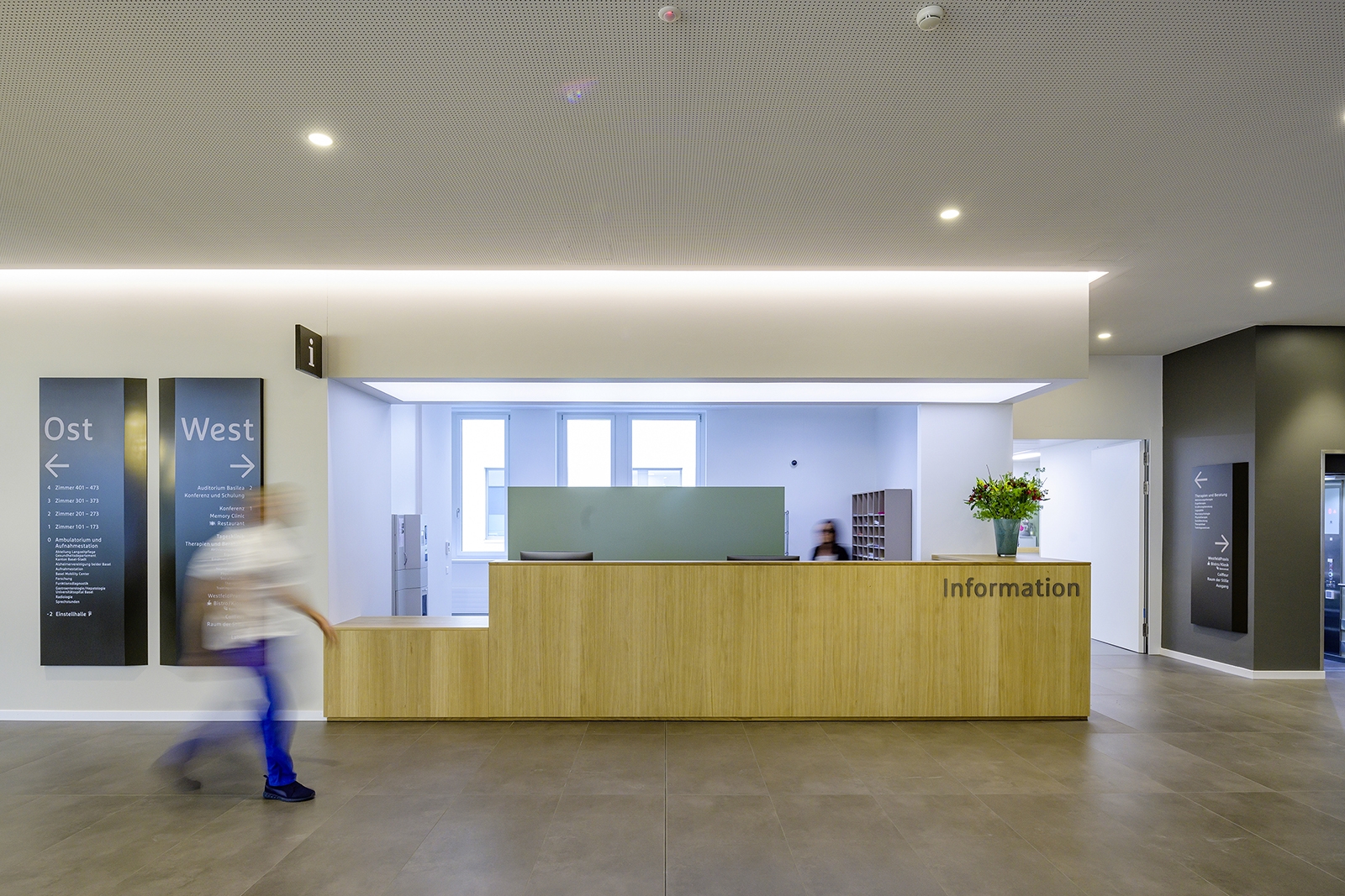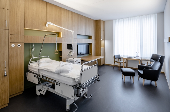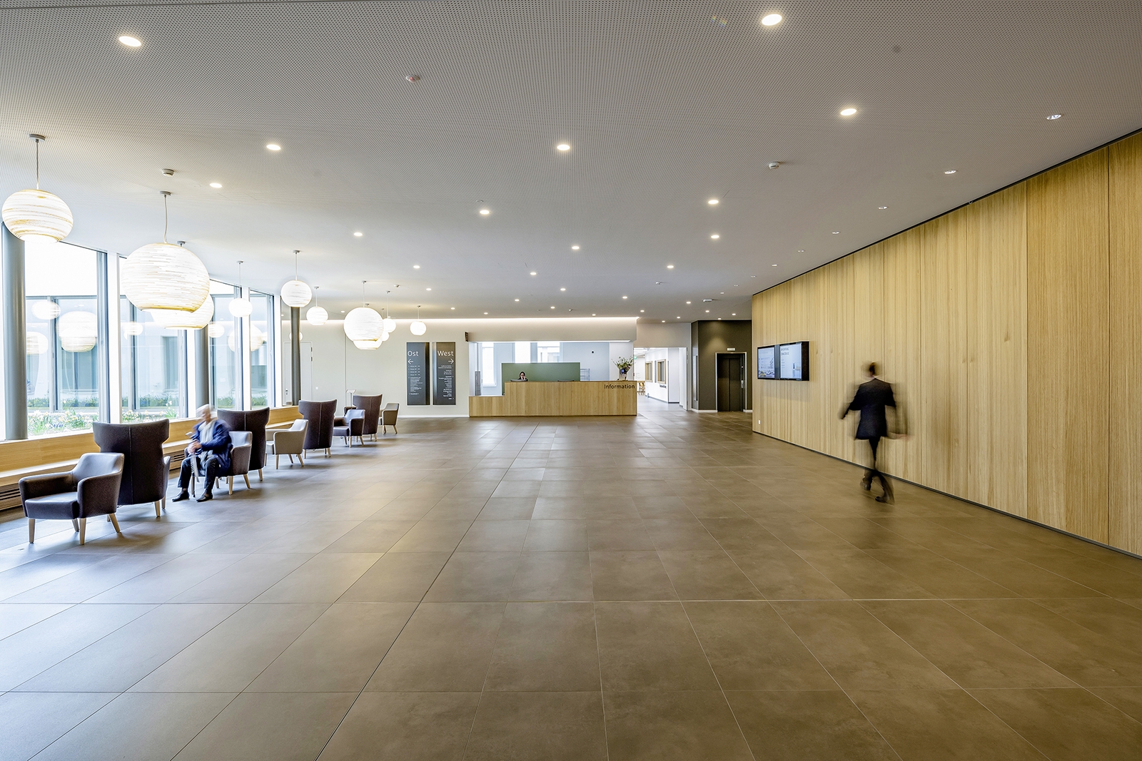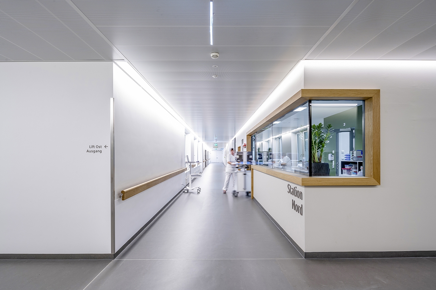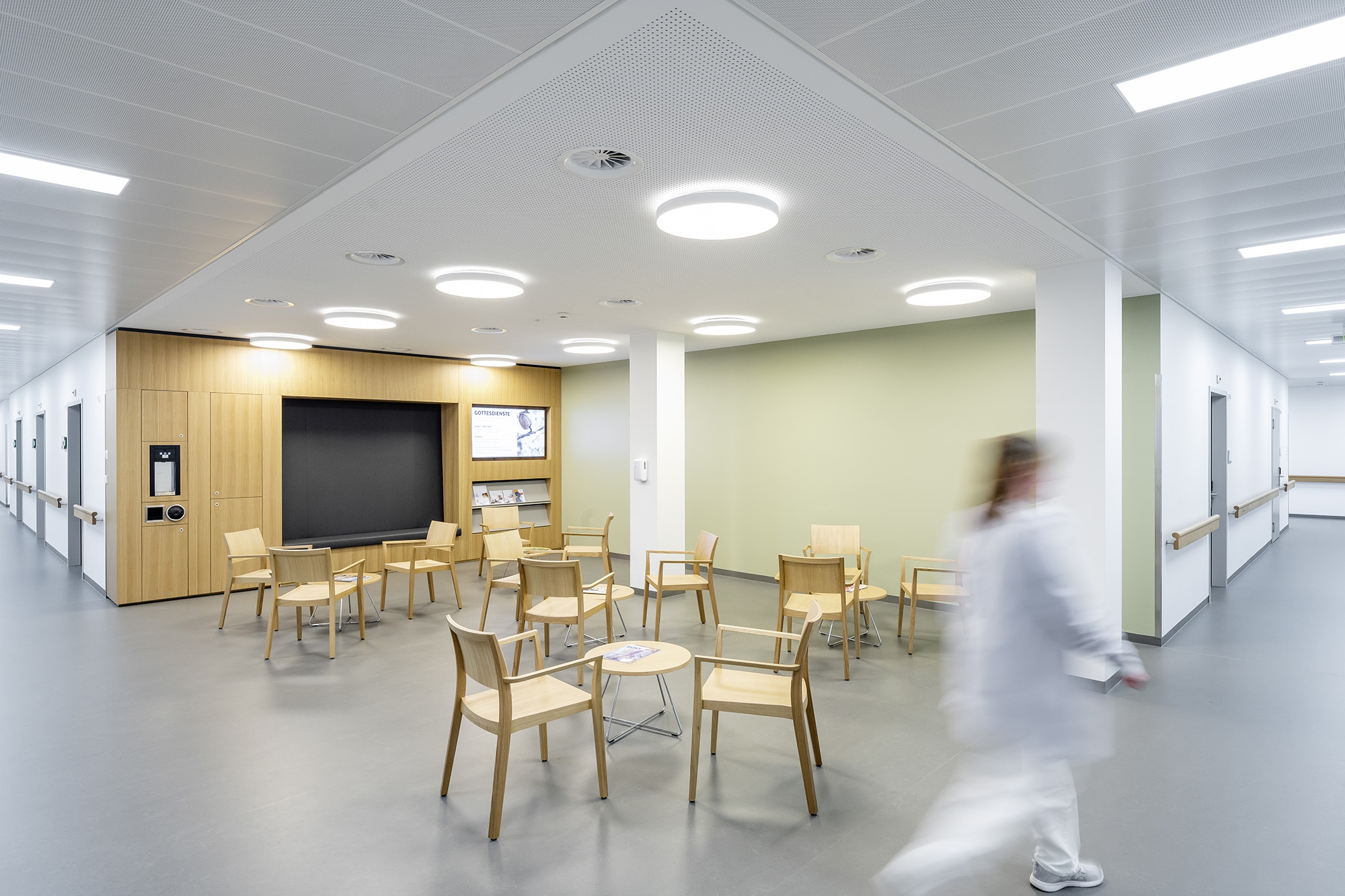 The transformation of this idea into the lighting design related to both the exterior and the interior. The routing by means of light lines in different variations was used for orientation in the building - the calm, visible light line as an accompanying element in the hallways above the handrail and the hidden line as a joint to mark the information stations. Communication areas are recognizable as round diffuse lights in different shapes, as a pendant solution, sometimes direct / indirect and also as a built-in lamp. They form a contrast to the accompanying lines and zone the open corridors and waiting areas, helping both guests and patients with subtle, emotional orientation.