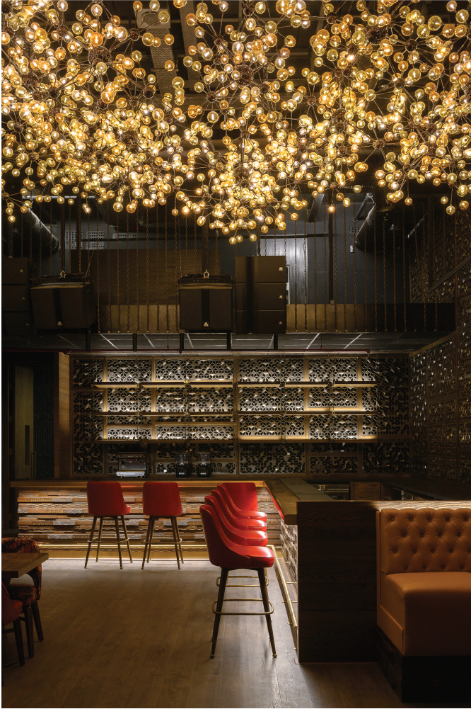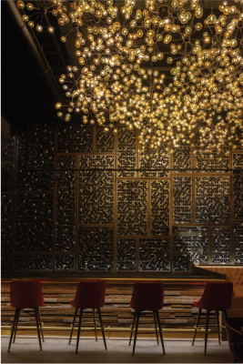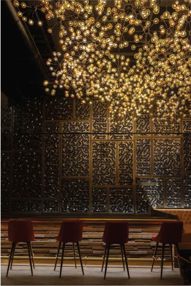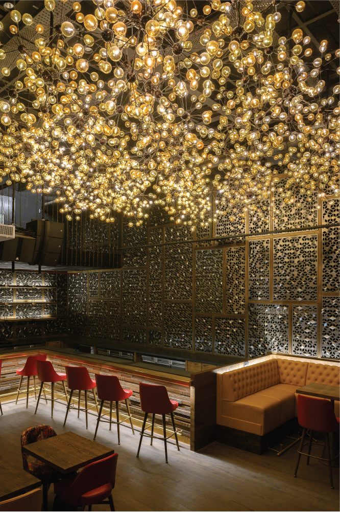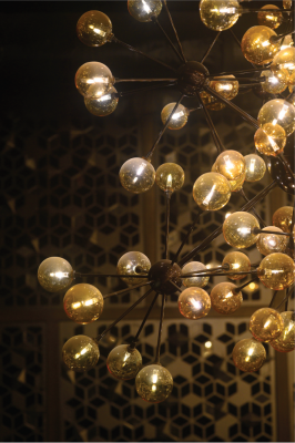 We all agree that nothing is more beautiful than dancing under a sky full of stars. The idea behind our project Stardust was to emulate the open skies and a starry night and bring our dreams to reality. The aim was to be able to give people the impression they were dining and dancing under a sky full of stars. It was a large-scale project project – 1000 sq ft composed of 24 chandeliers and 2400 glass globes, all automated to dim and brighten as per the requirement. The inspiration was derived from a structure of icosahedron and glass clusters forming a starry constellation. Each cluster size was upto approximately 36 x 36 “ with two different sizes of glass balls in the hues of amber and light yellow.