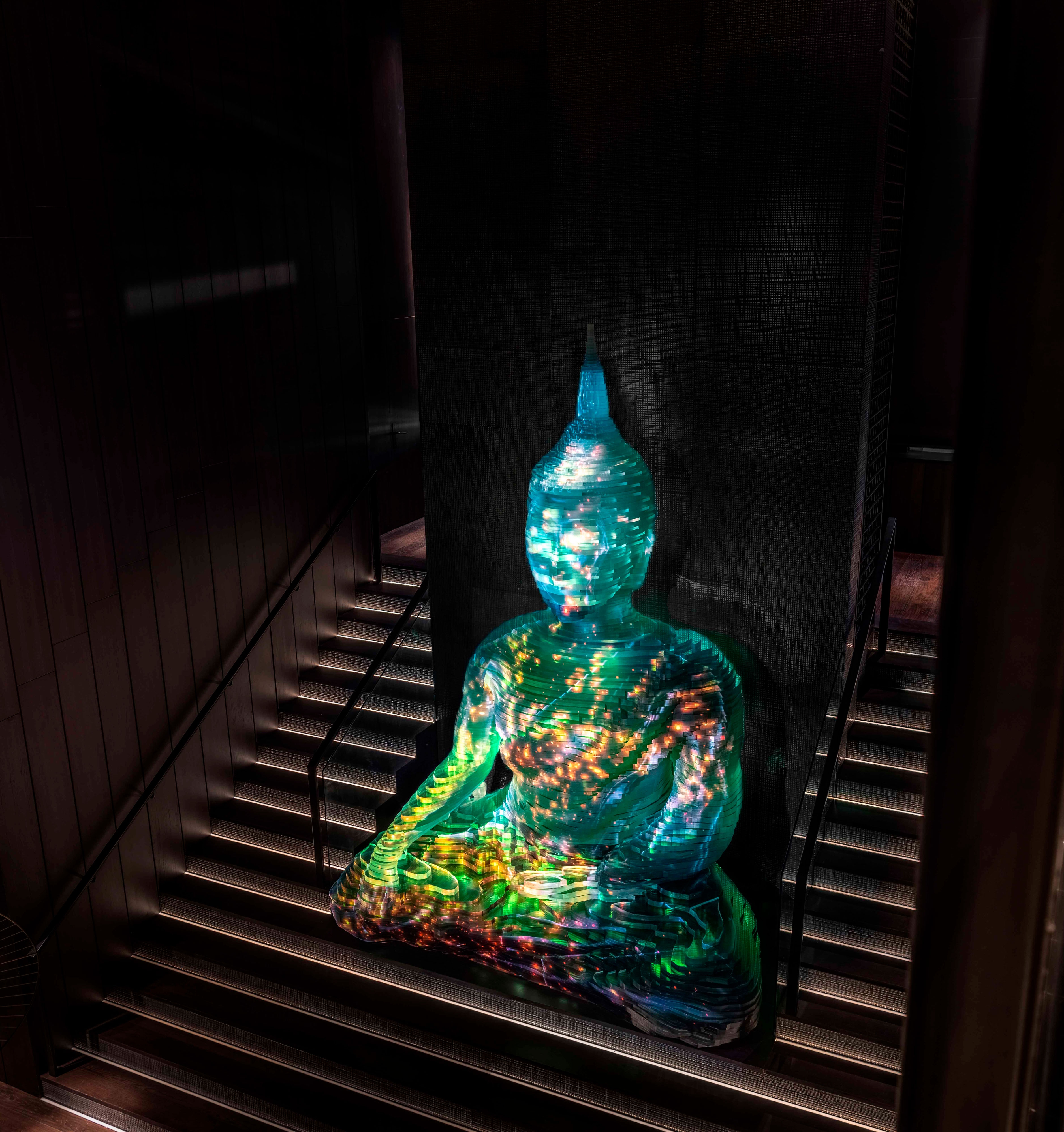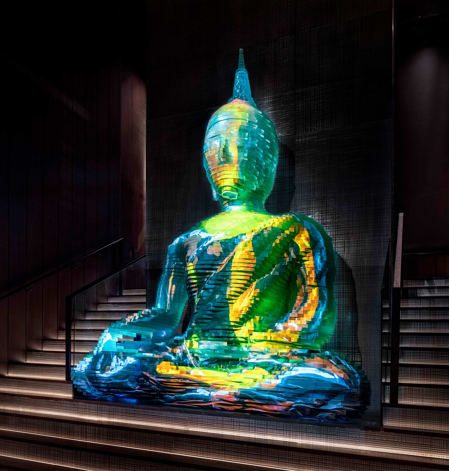 The dominant point of the interior is the parametric statue of Buddha. We stepped away from the traditional golden statue and offered to make the Buddha ephemeral using laser 3D mapping onto a sculpture made of glass slabs.