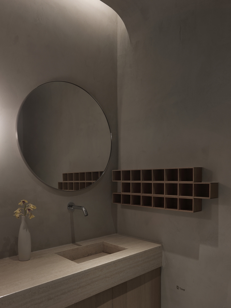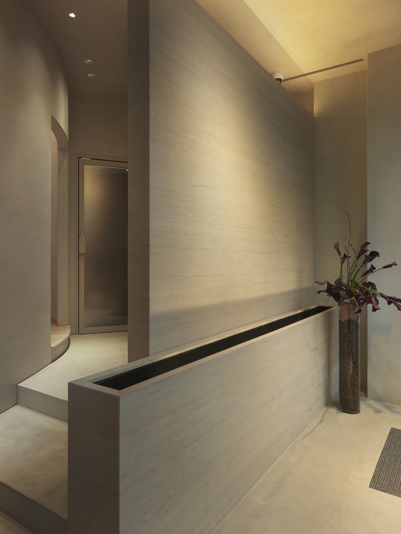 The muted lighting emanating from the lights hidden on top of the sandstone wall gives the space a simple, understated vibe.