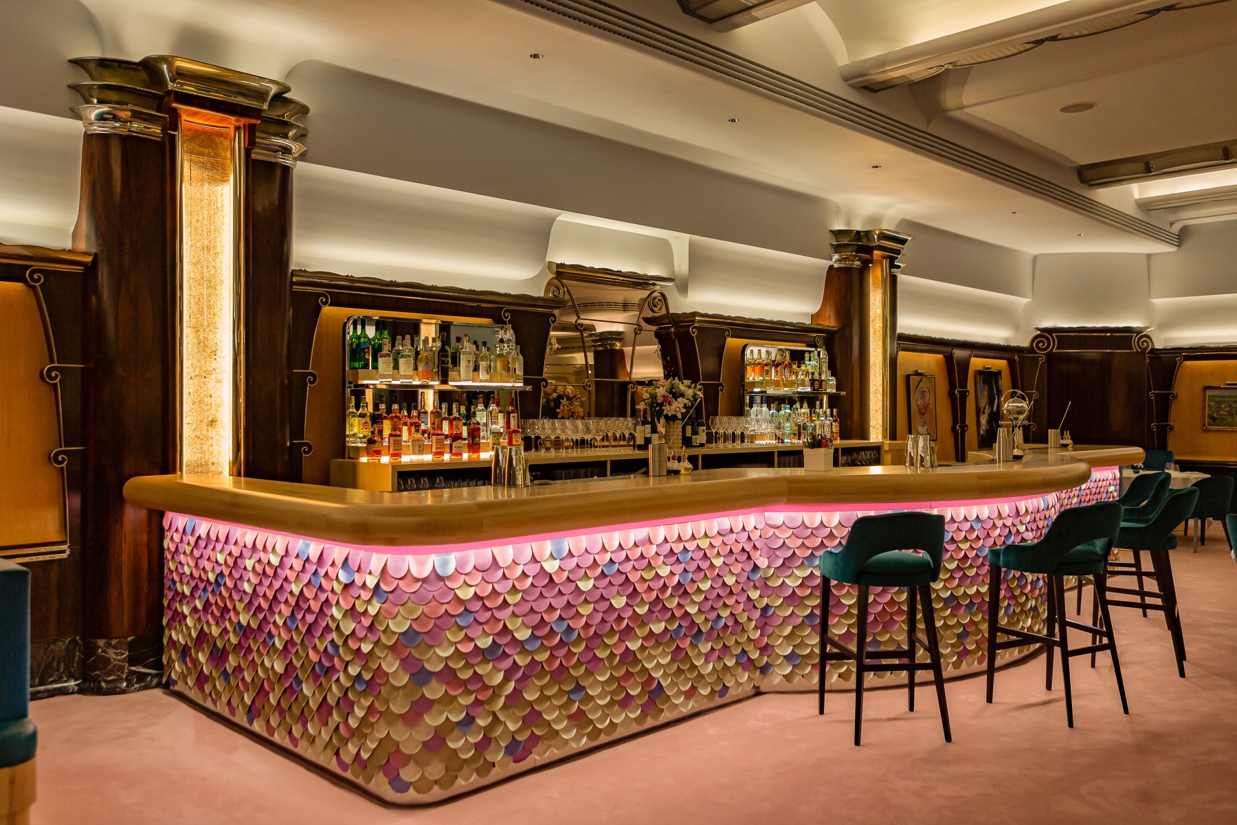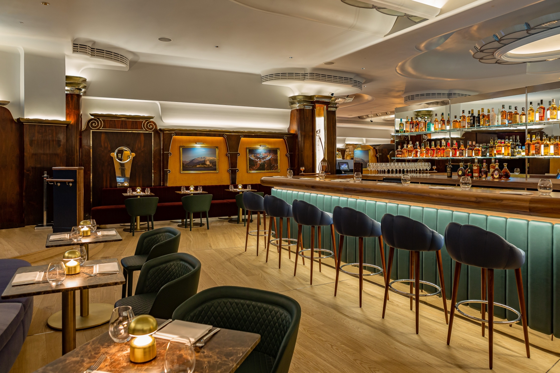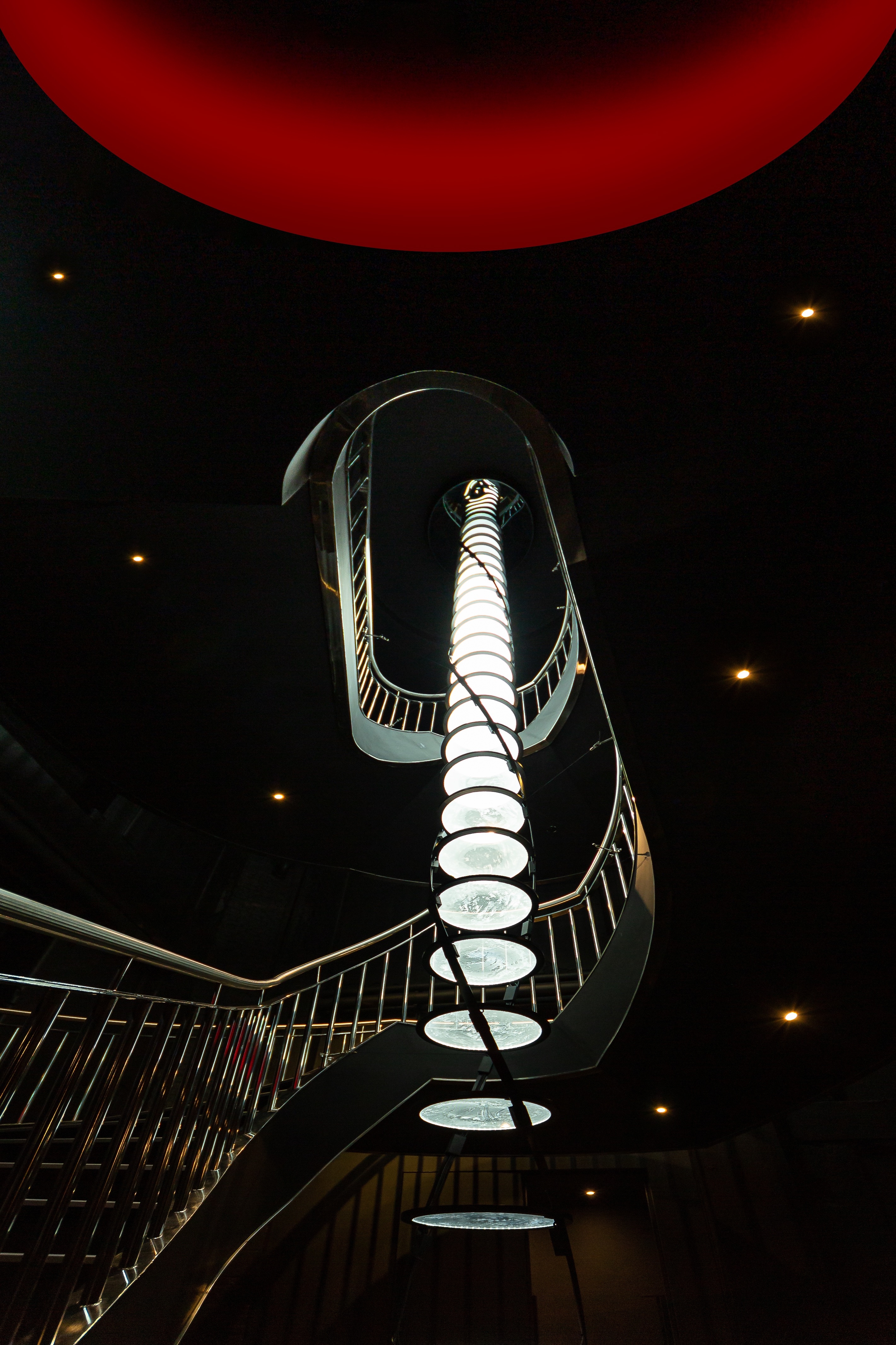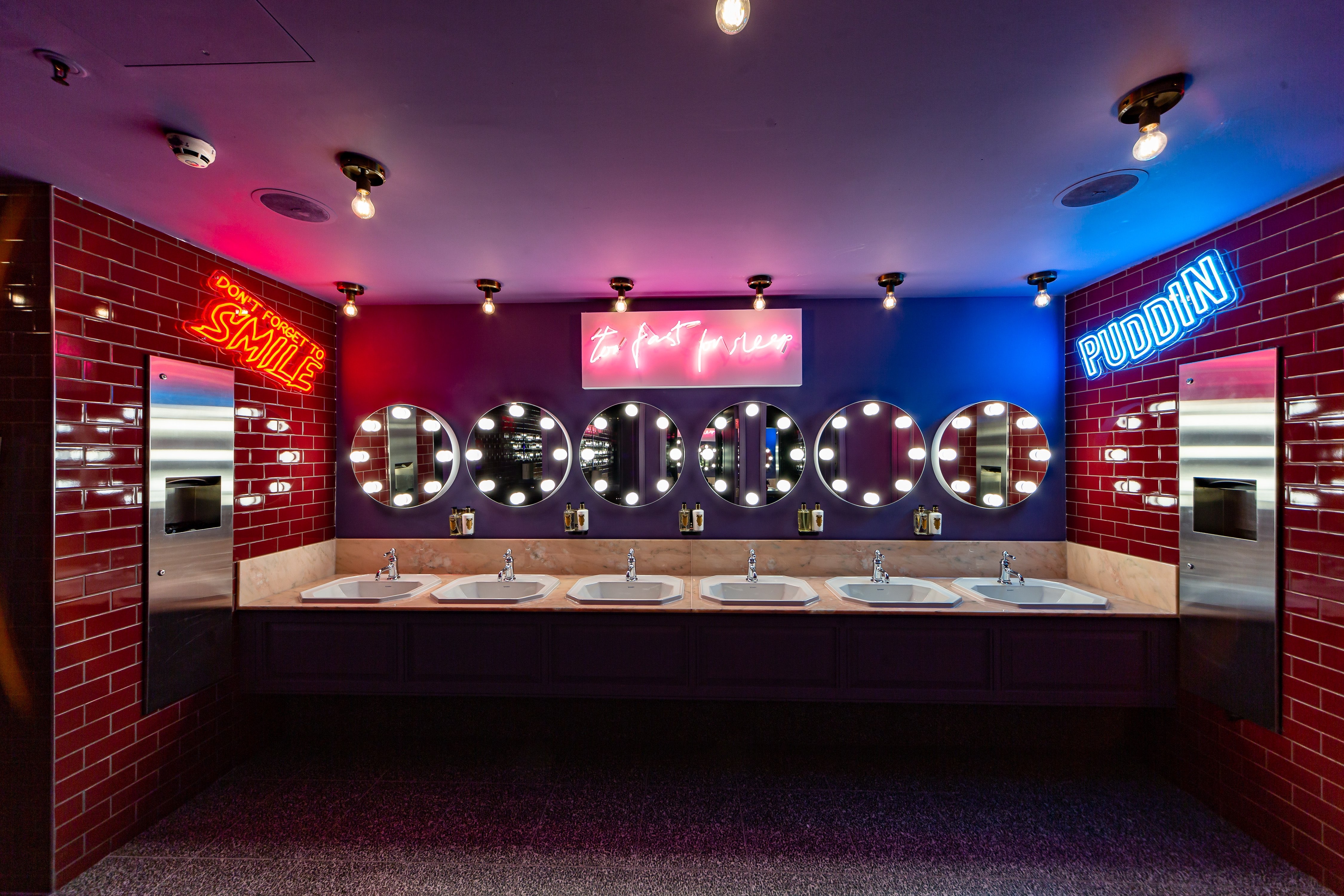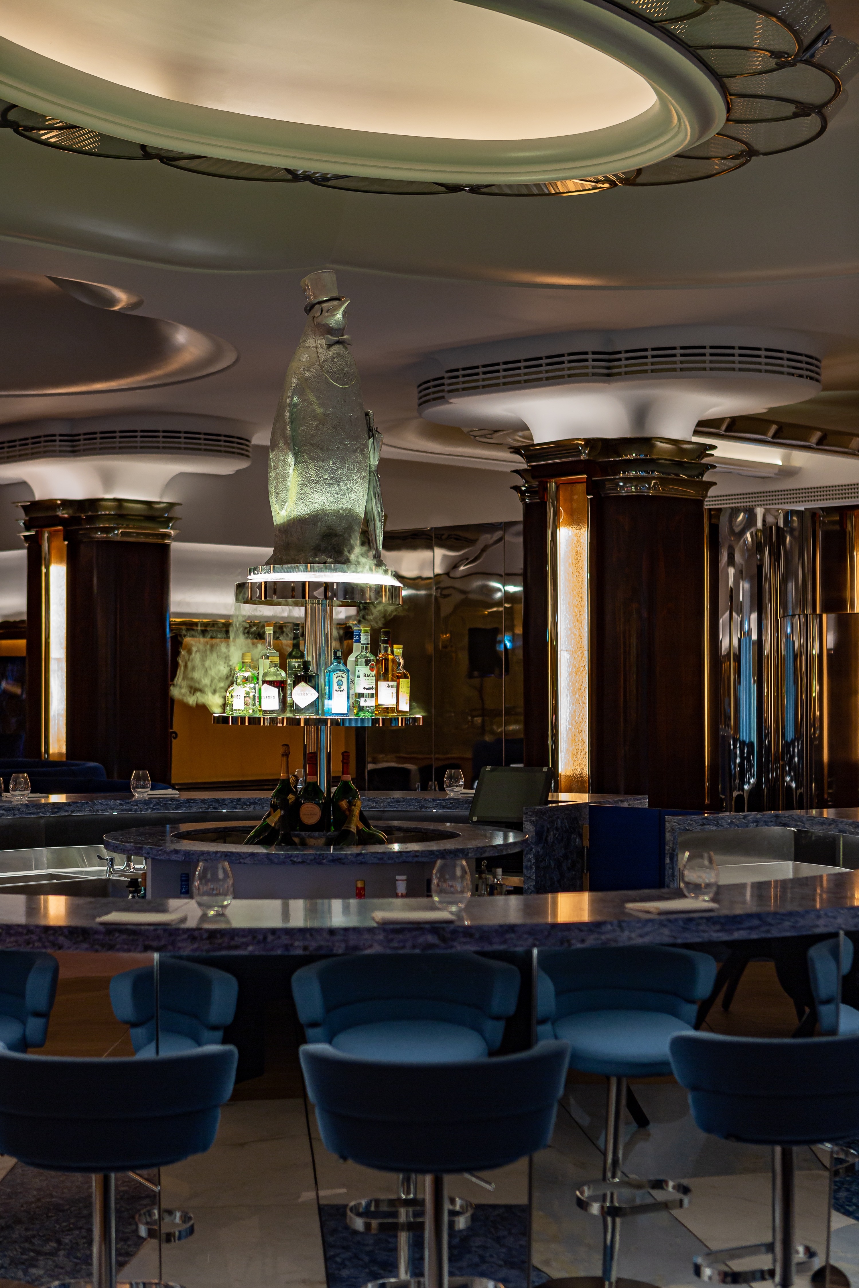 Entry DescriptionNulty’s lighting scheme for Park Row, brings Batman’s Gotham to life whilst respecting the listed building’s architectural features. The team used Art Deco lighting across the walls, pillars and ceiling, then added detail to accentuate the narratives told within the space. The Batcave - a black stairwell accessed via a secret bookshelf entrance - is lit by a 10m long chandelier by Nulty Bespoke, consisting of 25 transparent discs within a twisting helical structure. Each 400mm disc is edged with LEDs and lights up in a pulsating sequence that references the echolocation frequency of bats. Blacked-out pendant lights and discreet spotlights help visitors descend the stairs. Guests then enter Park Row, where a dramatic neon light within the ceiling coffer and a wall of mist mark the transition from Batcave to Gotham’s notorious street. In Pennyworth’s Bar, the team lit the bar beneath the counter to highlight the blue surface beneath and used LED strips in the sides of the gold leaf inlayed pillars to create a warm ambiance. In the Iceberg Lounge, a sculpture of The Penguin towers above bar and is lit from below, while clear glass plinth lights on tables bring the icy theme to life.