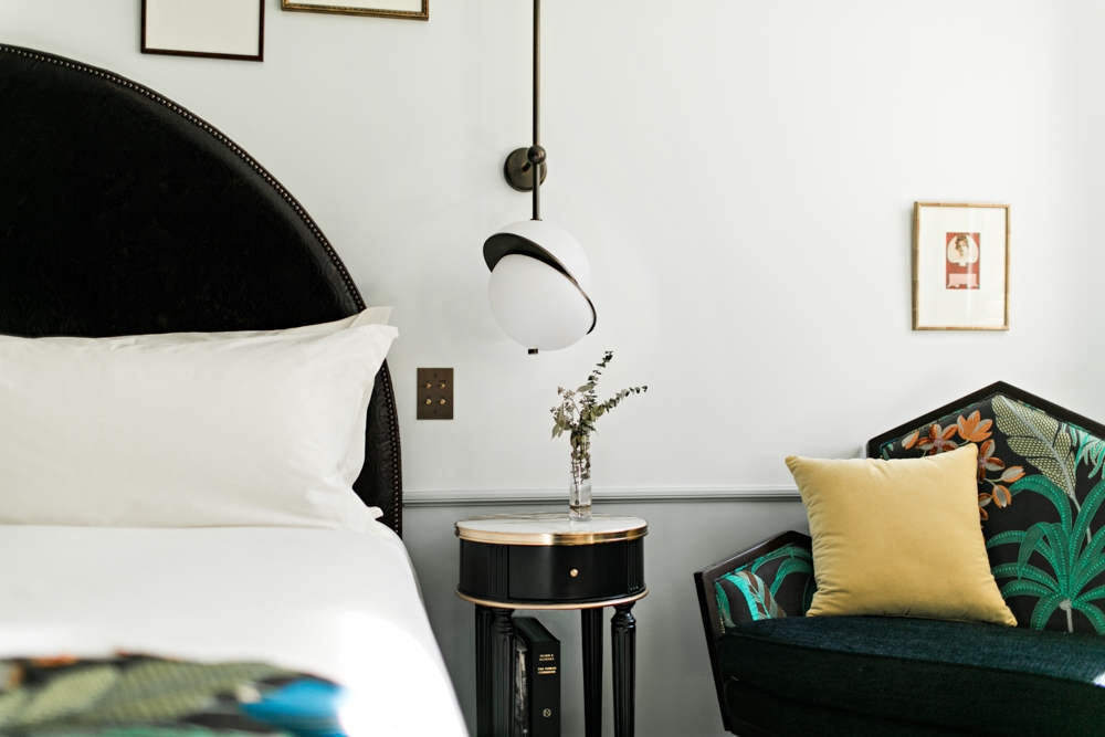 Hotel guestrooms utilize high efficacy dim to warm LEDs to ensure low energy use and reduce maintenance. The guestroom dimming system identifies guest arrival providing custom welcome scenes. To appease the traditionalists, all technology was concealed behind analog metal-engraved keypads which communicate with the control system.