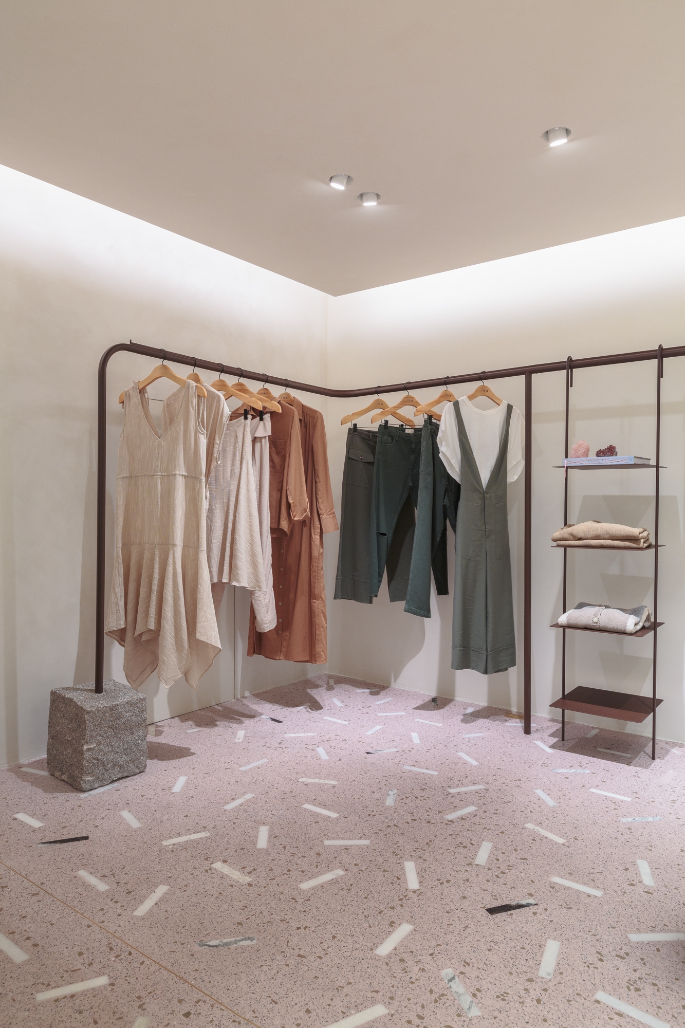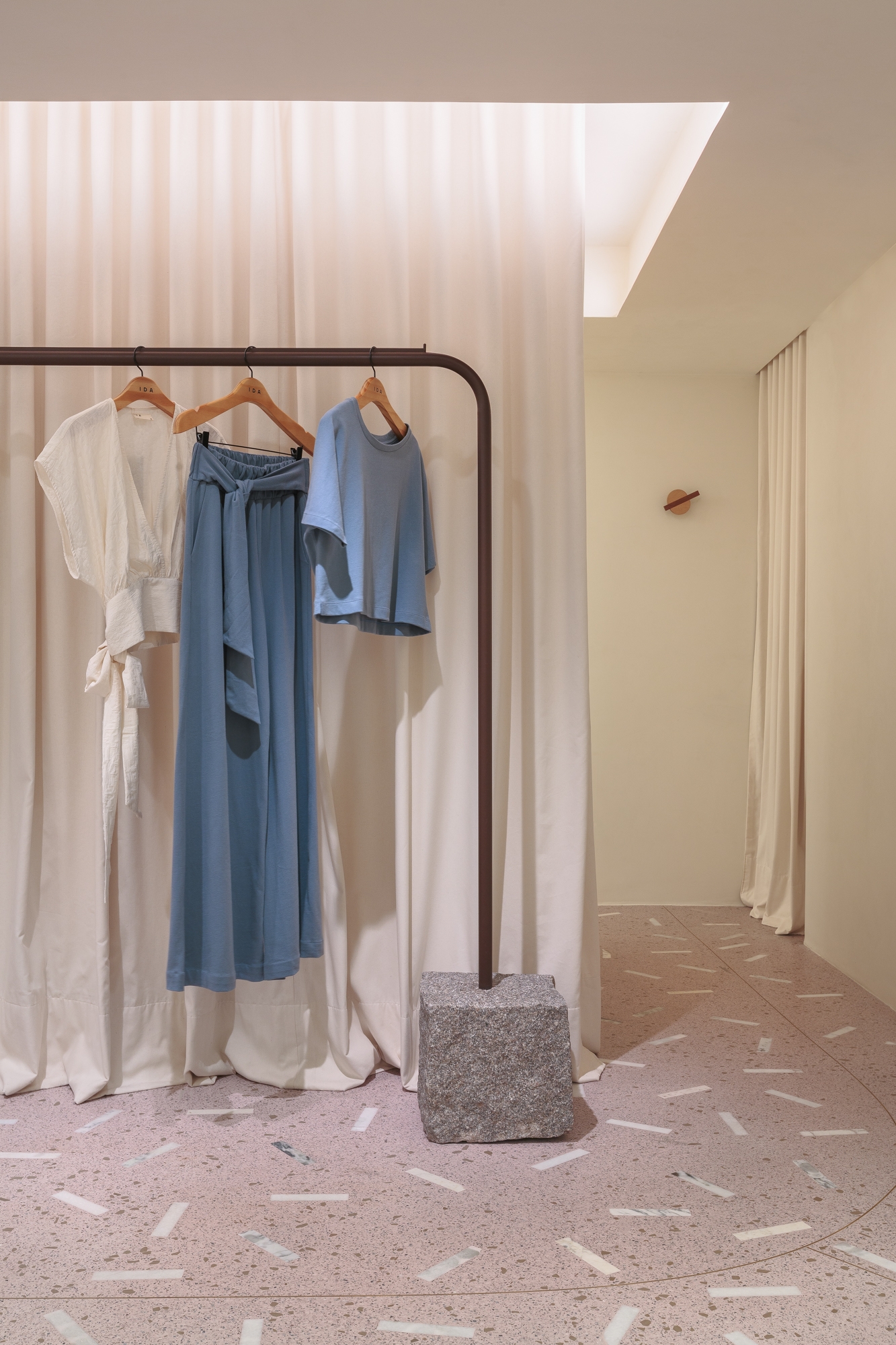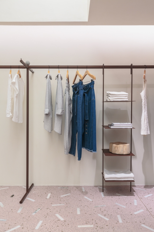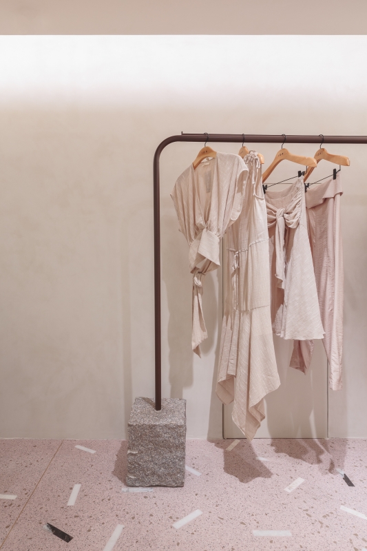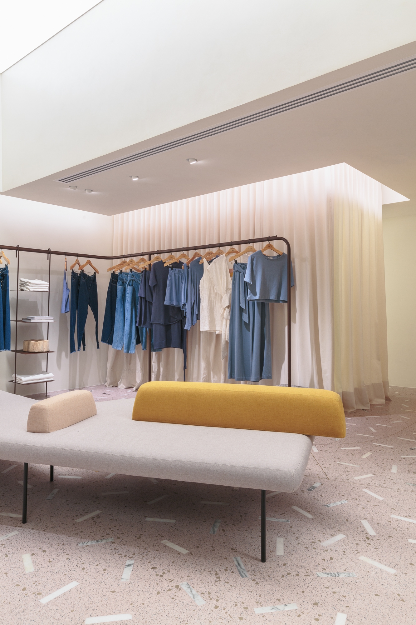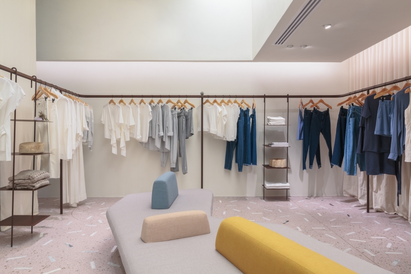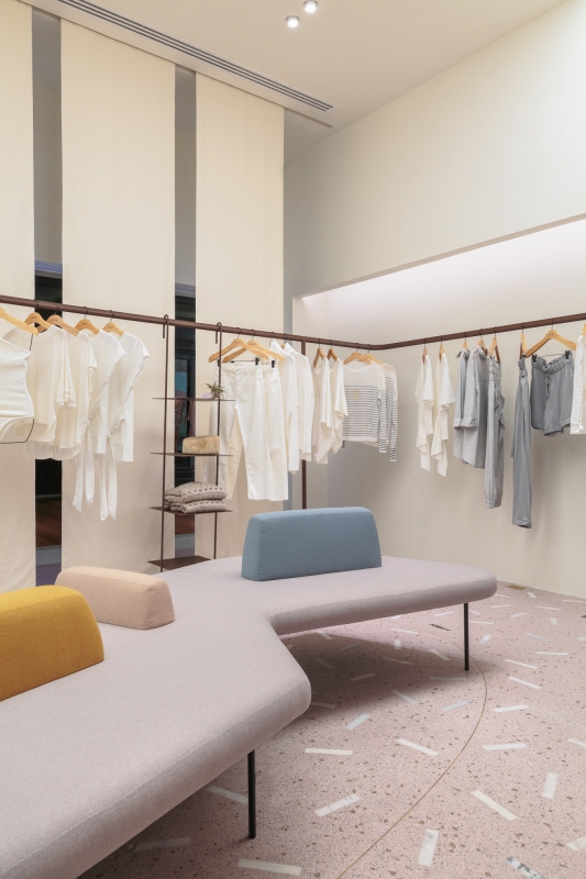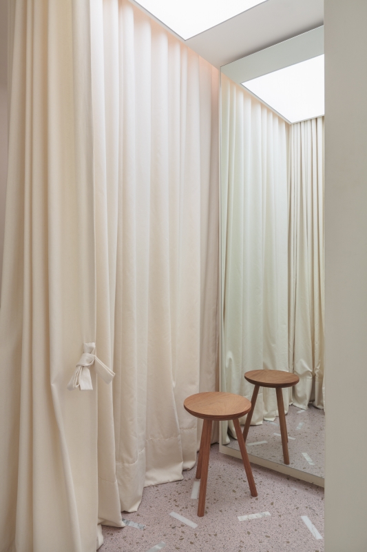 Inside the changing rooms, the use of a luminous ceiling brought a feeling of spaciousness to the more inclosed areas of the store.