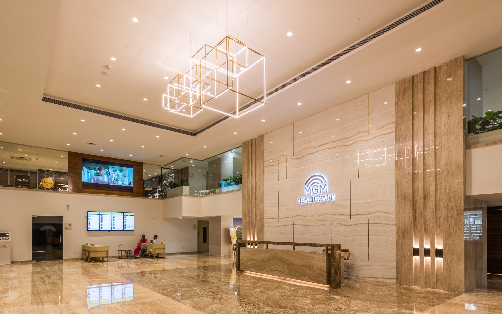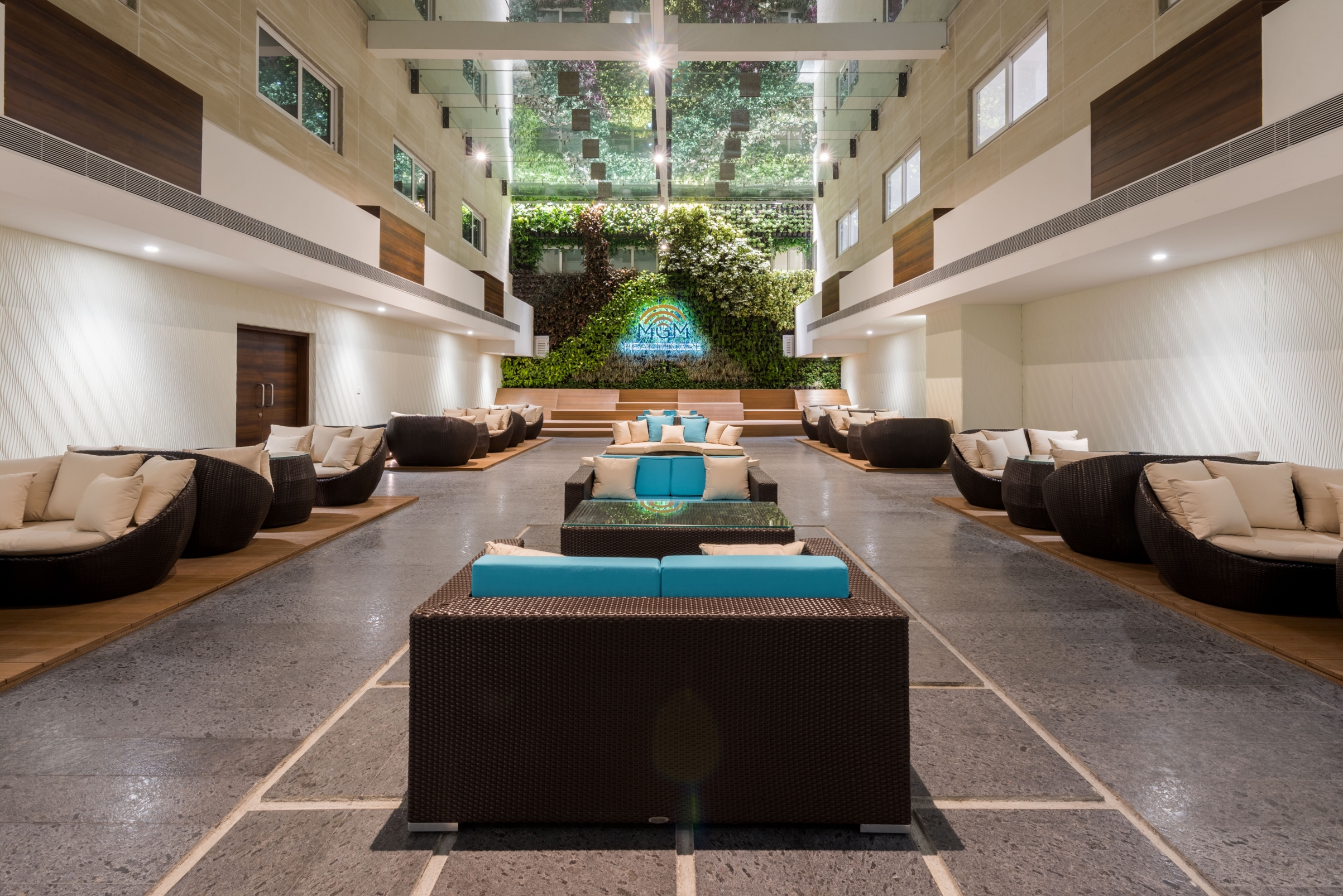 Entry DescriptionMGM Healthcare is India’s first USGBC LEED Platinum-certified super-specialty hospital, with lighting that supports doctors and therapists during treatments, and promotes the healing process in patients with an increased sense of wellbeing. Preliminary brief was to elicit certain emotional responses from hospital users with functionality and style of an inviting yet professional hospitality environment. Lighting had to reflect ethos of healing and sense of serenity: lobby lighting should not be overabundant to cause feelings of an emergency room; corridor lighting should not cause direct glare while moving patients in stretchers or wheelchairs; cafeteria lighting should be bright owing to its high-intensity hours of operation that keeps staff and visitors awake and alert; administration office lighting should be optimum for all paper and screen work. Lighting for training rooms that double-up as an auditorium space required flexibility to meet dynamic requirements of meeting, learning, sharing ideas and collaborating. The city’s tallest green wall nestled under a natural skylight required supplemental illumination for certain sections not receiving desired illumination.