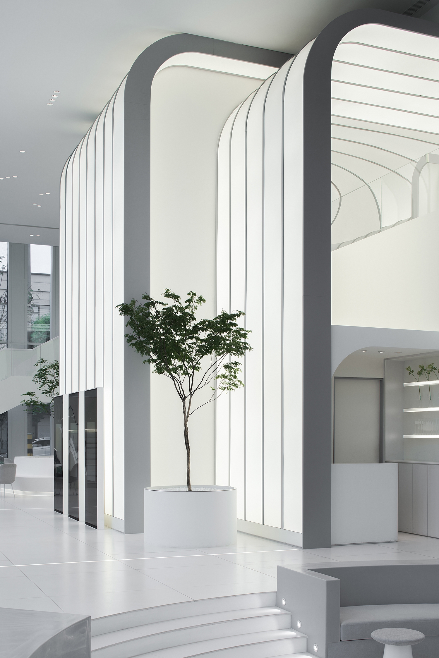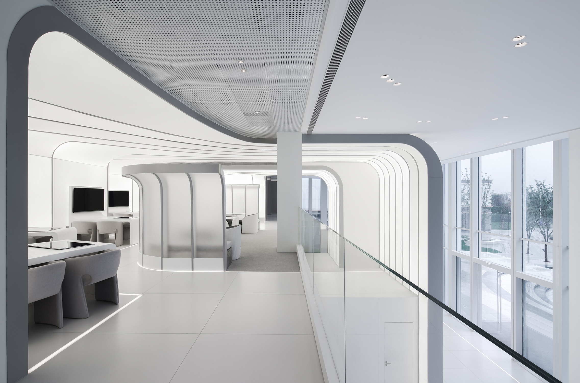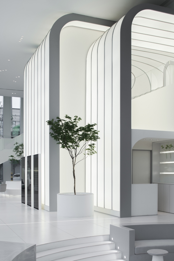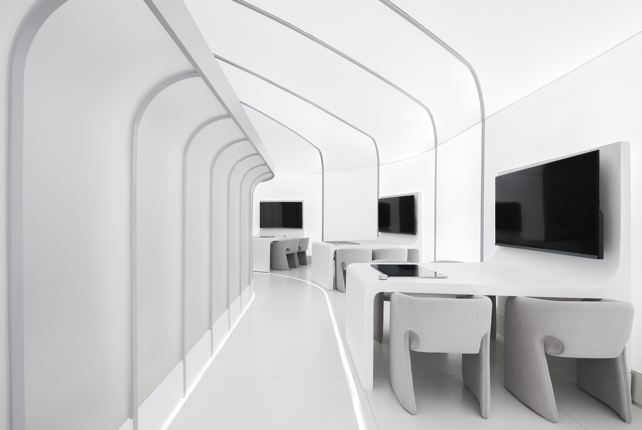 4000K colour temperature used for luminous surfaces and graphical details paints the ambiance in pure neutral white for a hi-tech interpretation. To keep the ceiling clean, small downlights are planned in clusters, sometimes echoing the curved forms below in their layout. Discreet and low glare downlights with 3500K were used to flatter skin tones and maintain some warmth for a residential feel.