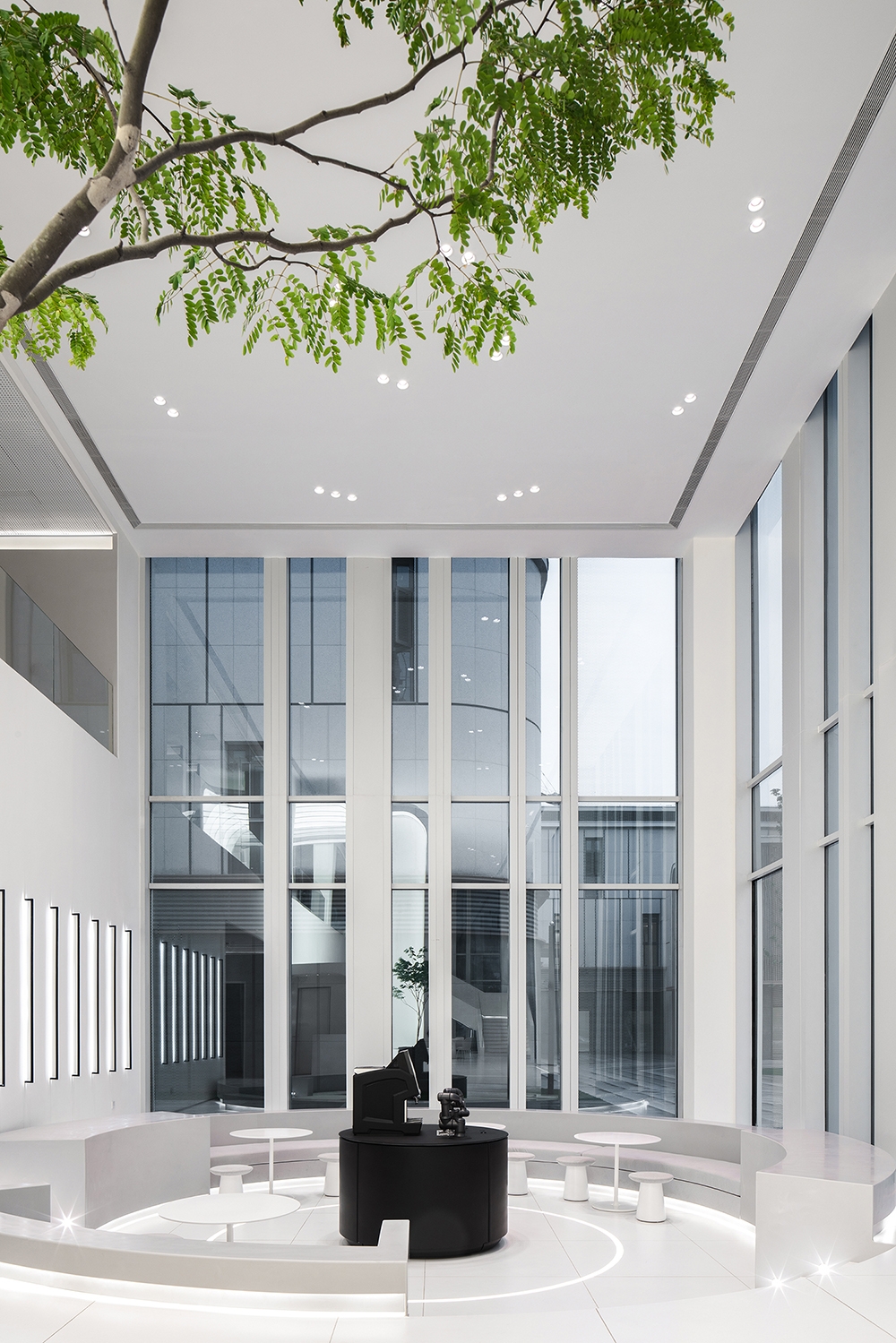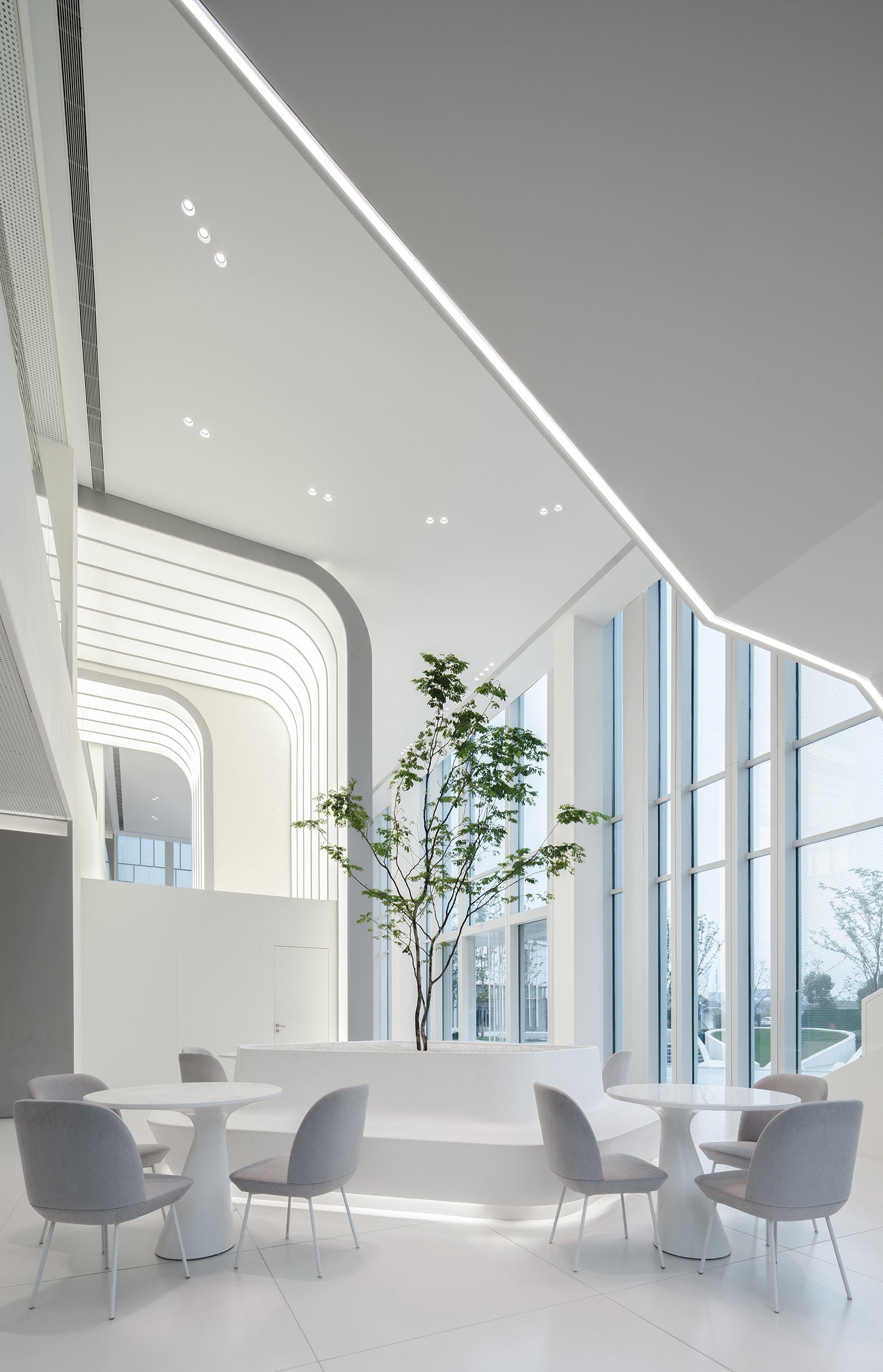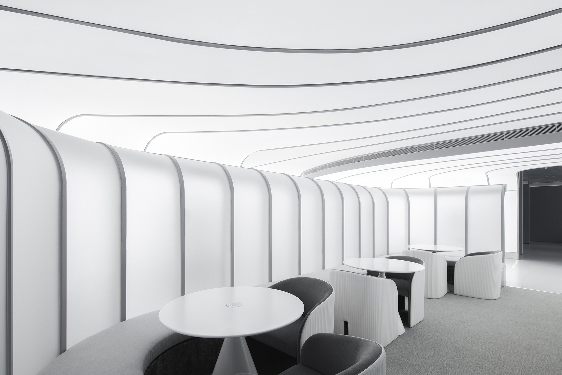 4000K colour temperature used for luminous surfaces and graphical details paints the ambiance in pure neutral white for a hi-tech interpretation. To keep the ceiling clean, small downlights are planned in clusters, sometimes echoing the curved forms below in their layout. Discreet and low glare downlights with 3500K were used to flatter skin tones and maintain some warmth for a residential feel.