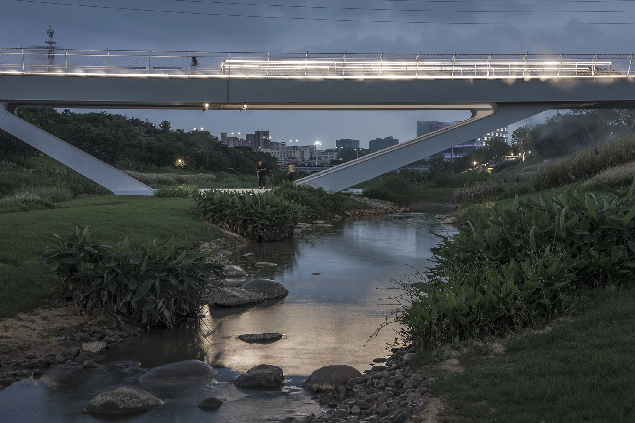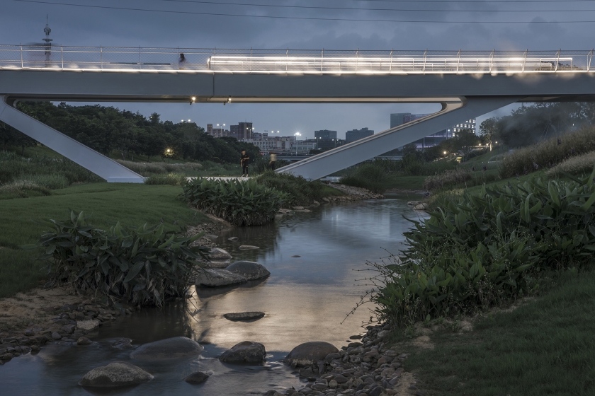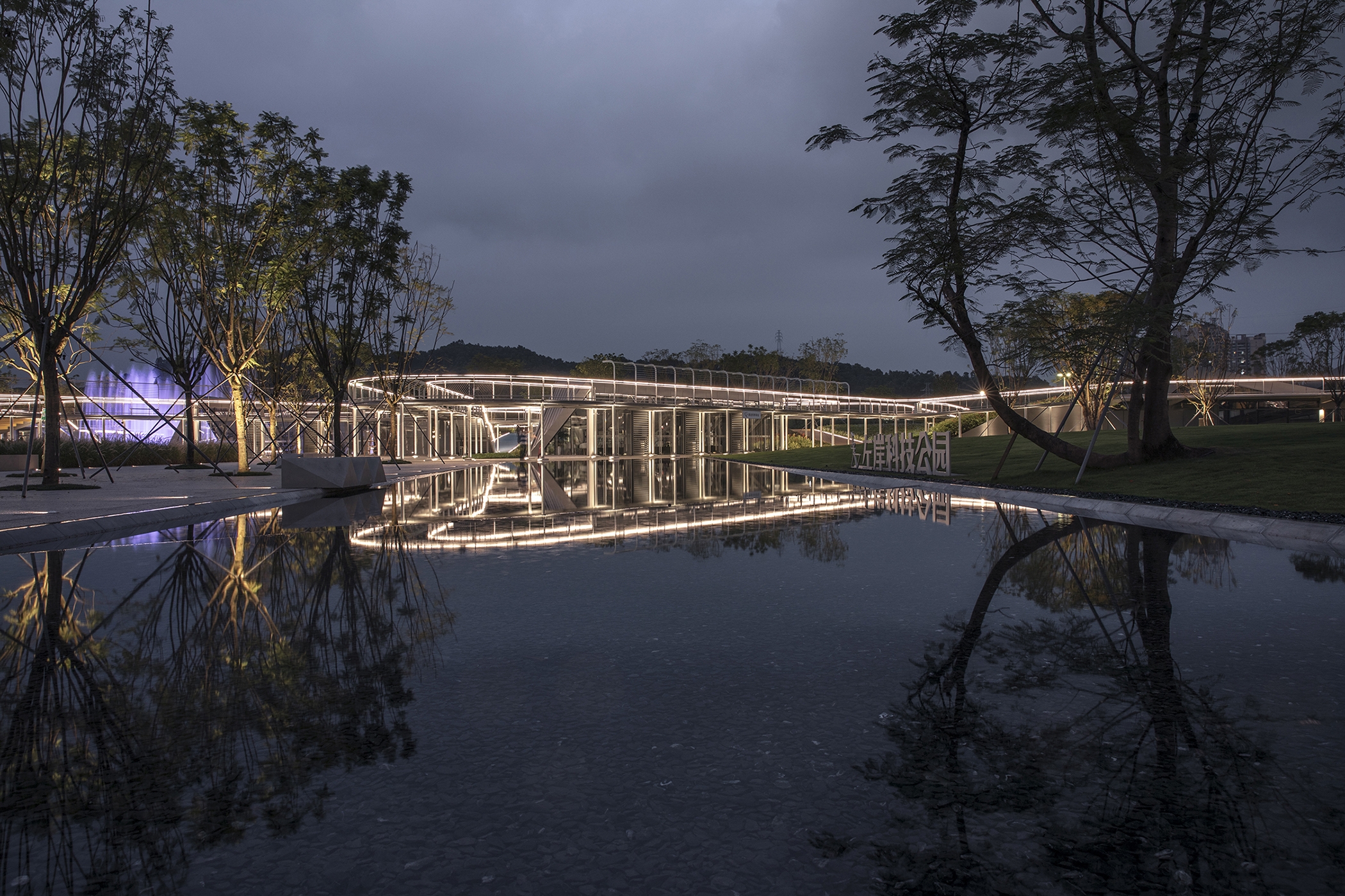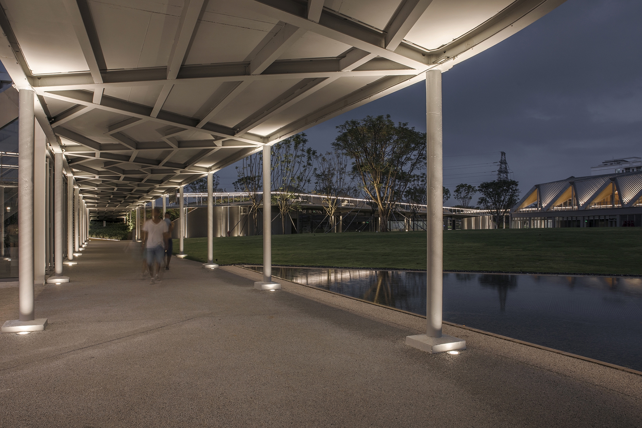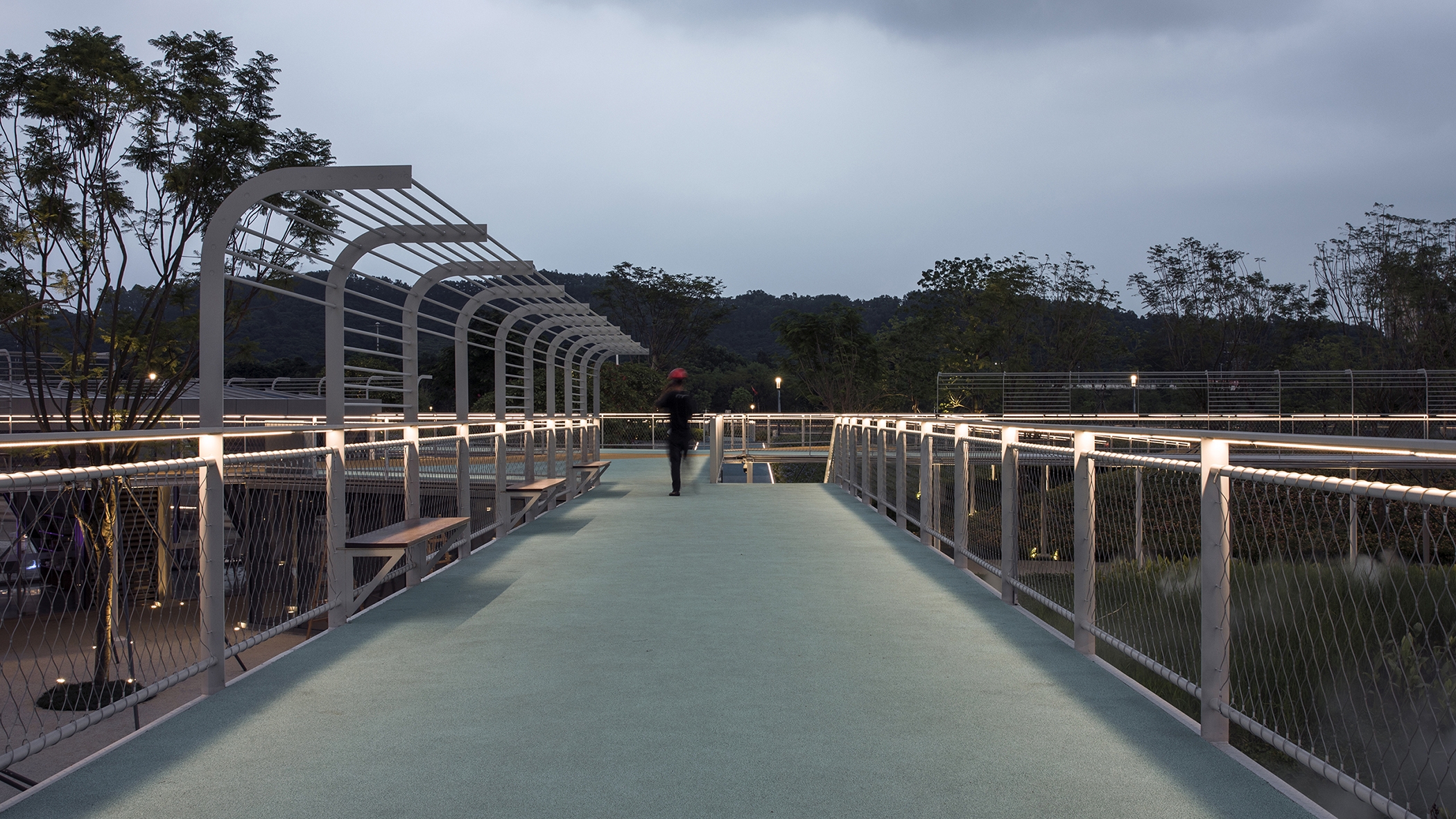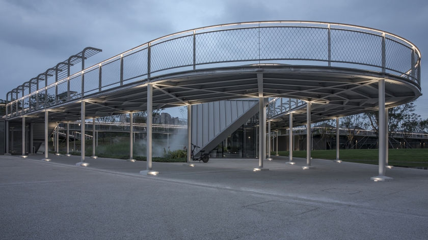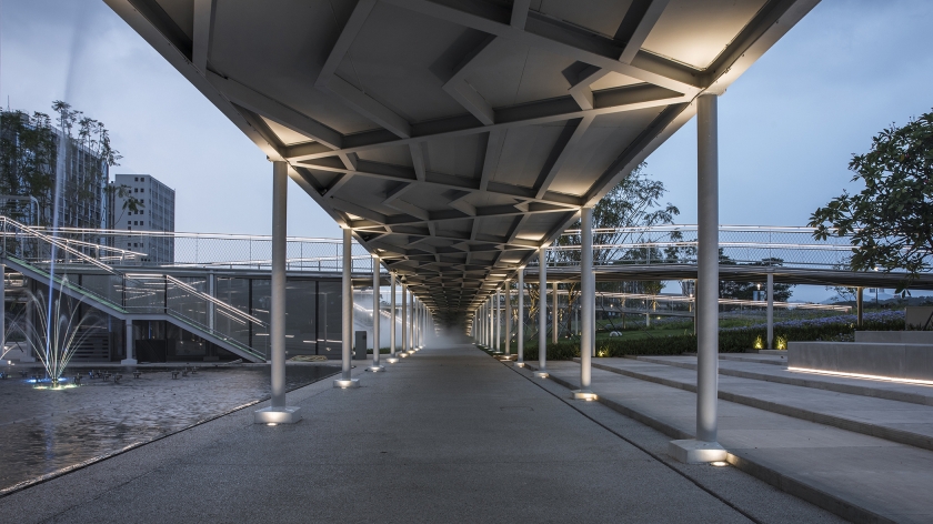 The lighting design of the park mainly addresses the issue of functional lighting and taking into account the landscape lighting. Anti-glare buried lamps are used on the ground floor to illuminate the pillars and ceiling to ensure soft reflected illumination in the walkway. The sky corridor adopts 3000K linear lamps embedded in the handrails of the corridor bridge to provide functional lighting on the ground and ensure the continuity of the night landscape space.
