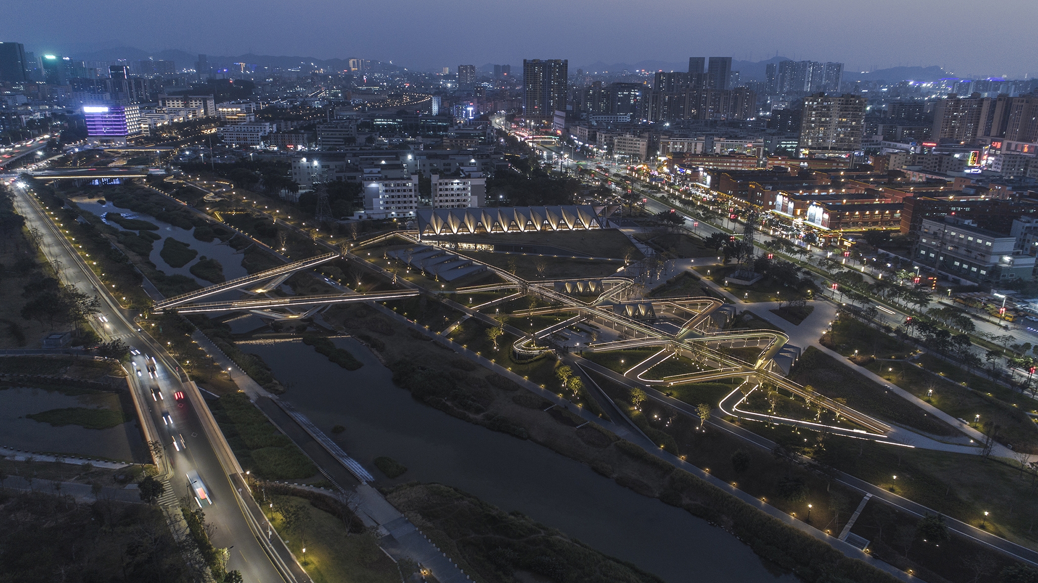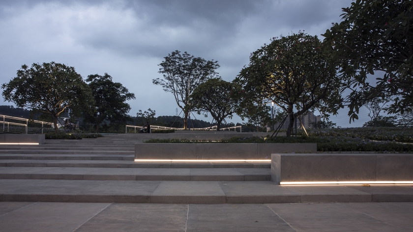 Lighting design continues the architectural concept. It uses continuous linear light to strengthen the "double-line" landscape form and combined with DMX512 control system to achieve the dynamic effect of "double-line flow" during special periods. A lighting control system not only increases vitality at night, but also conducive to light energy savings. Lighting scenes in weekday, weekend, and festival modes provide a better balance between visual effects and energy control.