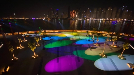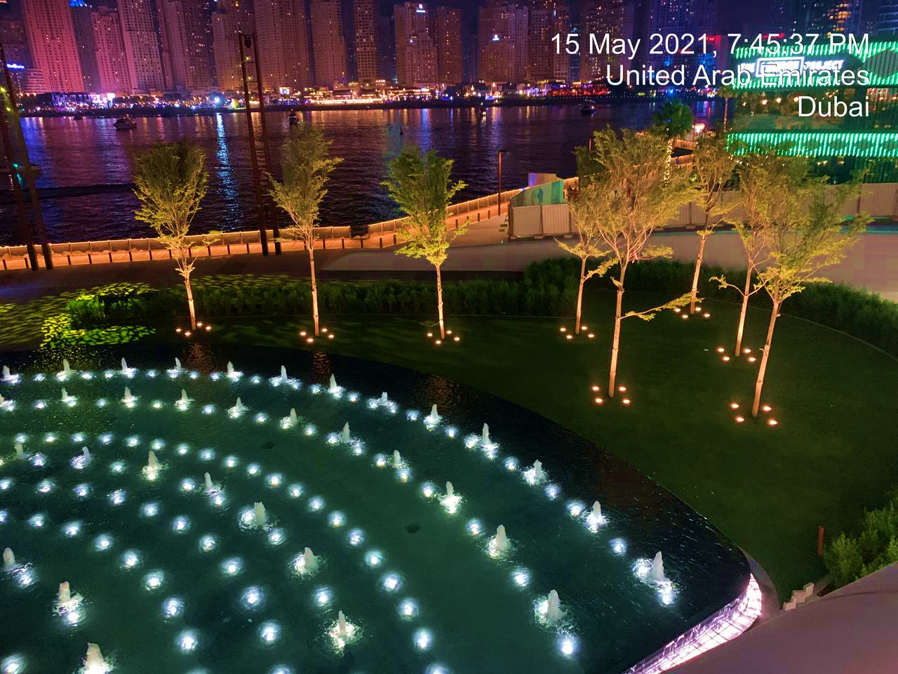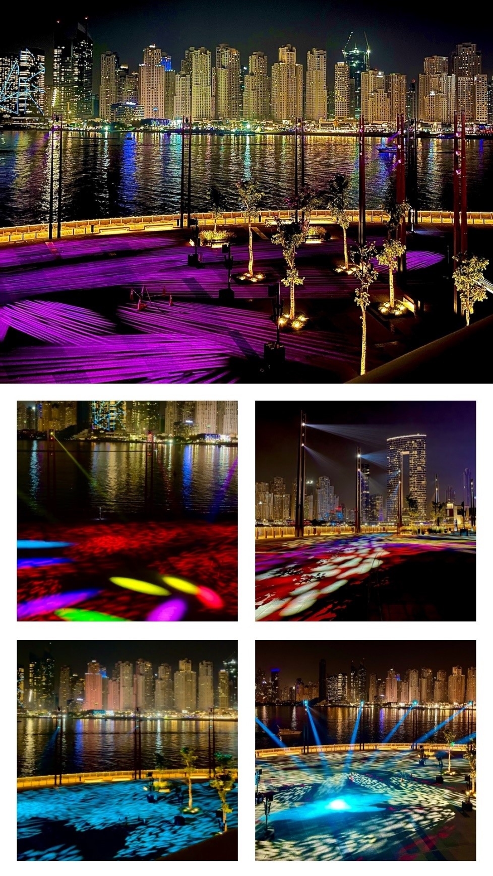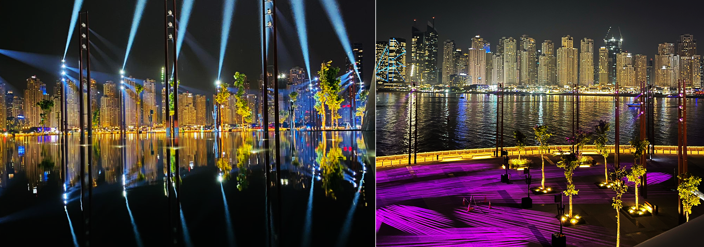 Ain Dubai Plaza lighting design represents the apogee of the vibrant lifestyle destination which Bluewaters Island is known for. As the visitors approach Ain Dubai, the drama and excitement of a world-class retail and entertainment zone which is evident throughout the Bluewaters retail strip, gradually builds up and culminates in a dazzling display of colours and animated light show in the plaza. Complimenting the fun and colorful lighting principles of the Bluewaters retail strip, the plaza lighting comprises of traditional architectural landscape lighting principles as well as dynamic entertainment lighting elements. The plaza features seventeen 16-metre-high lighting totems which complement the aesthetics of the existing streetlights along the Bluewaters retail promenade. Each totem houses a cluster of gobo projectors and a state-of-the-art moving head in order to create an exciting array of color and image projections in the plaza area. The lighting scheme aims to create a drama and to arouse interest for the visitors, whilst setting an alluring and vibrant stage for Ain Dubai, the world’s largest observatory wheel and its entertainment light show.