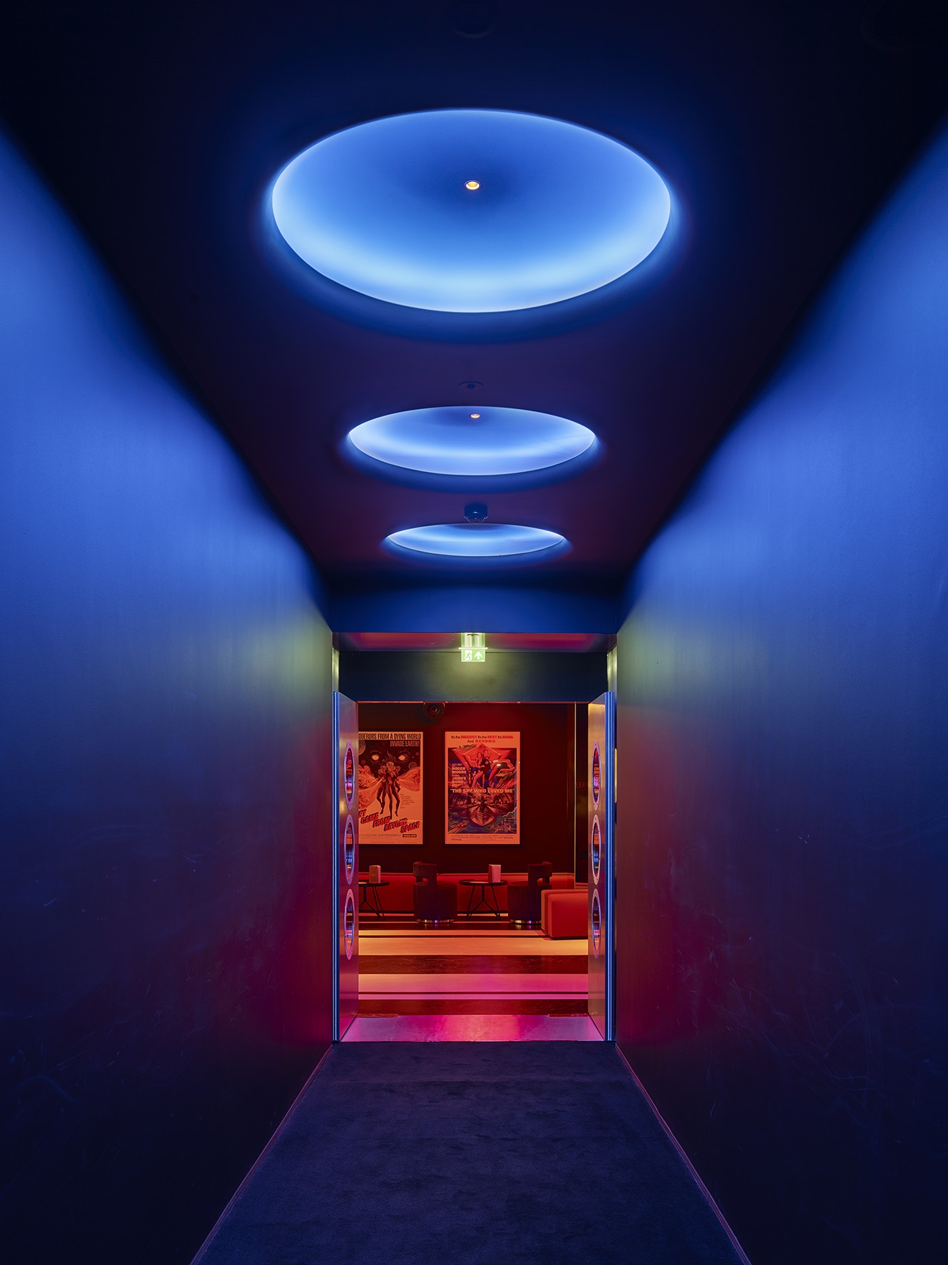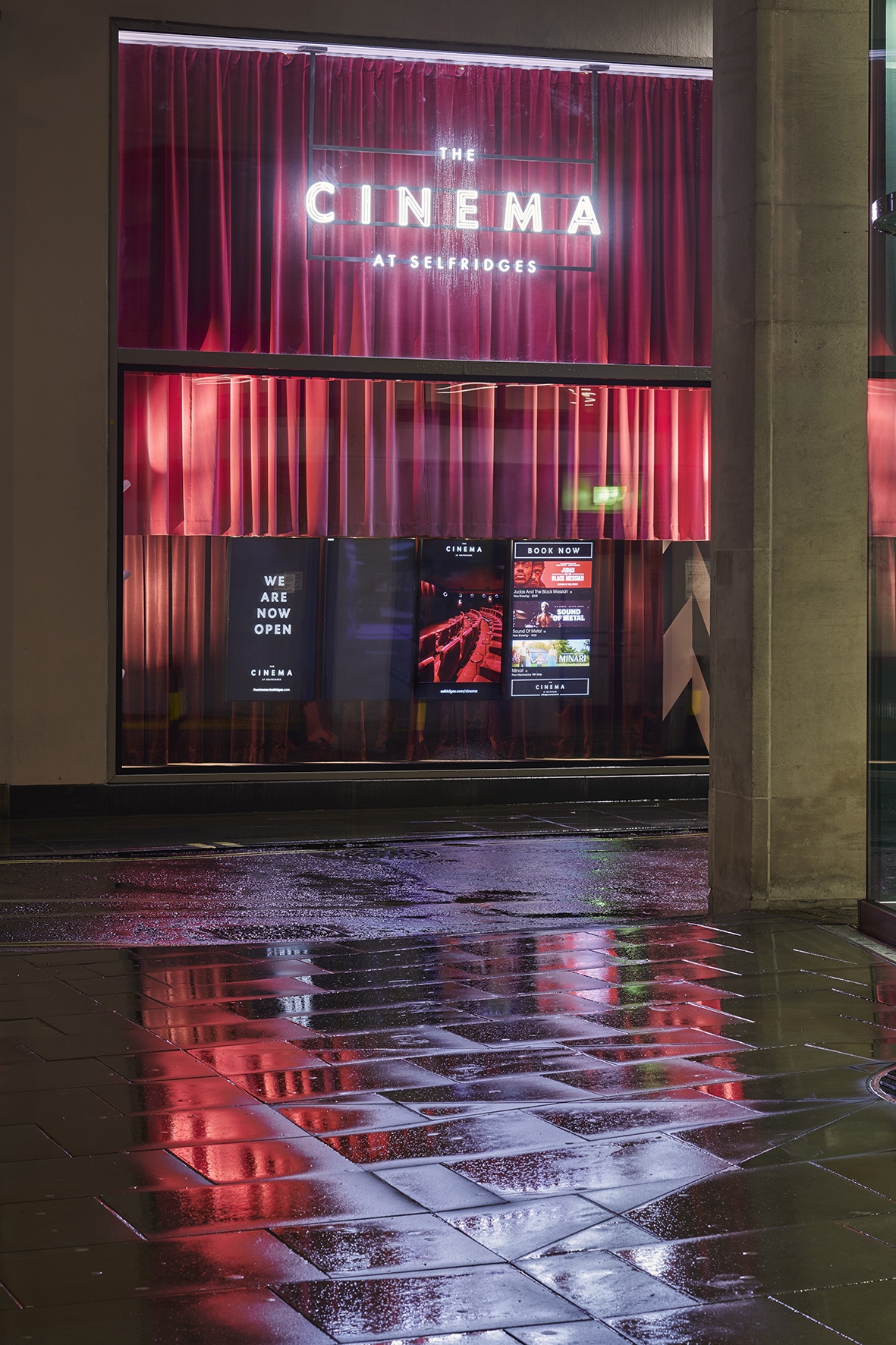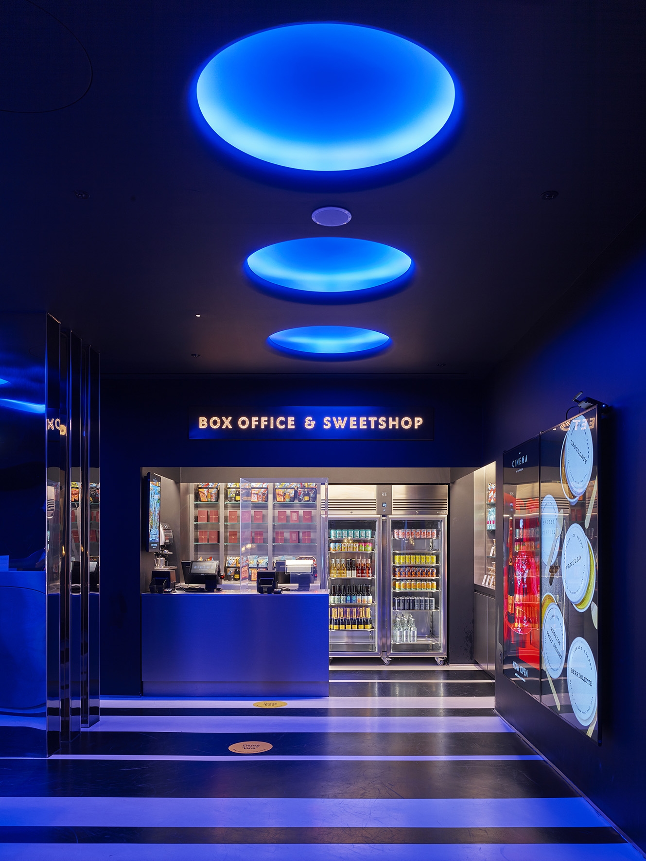 Entry DescriptionThe Cinema at Selfridges, it’s the first permanent department store cinema in the world. The interior is designed with cinema in mind and a retro flair in the detailing of the interior. The audience are transported to a flamboyant set reminiscent of a David Lynch film. The colour palette of the interior is enhanced and complimented by the dynamic lighting strategy: Accent lighting on saturated coloured surfaces, colourful light wash with RGB dynamic changes and light play between reflective panels. The lighting of the canopy in the entrance resembles the old, iconic theatre entrances as it consists of hundreds of light bulbs mounted on a reflective surface. Each screen room has its own colour (Green, Red, Blue) identity and some common lighting features such as the accent lighting on the seats and the screen curtain. Entering the bar, the visitor is immersed into a retro atmosphere with intense colours that remind the psychedelic 60s interiors. The lighting enhances the bold textures and colors and creates micro – atmospheres within the space.