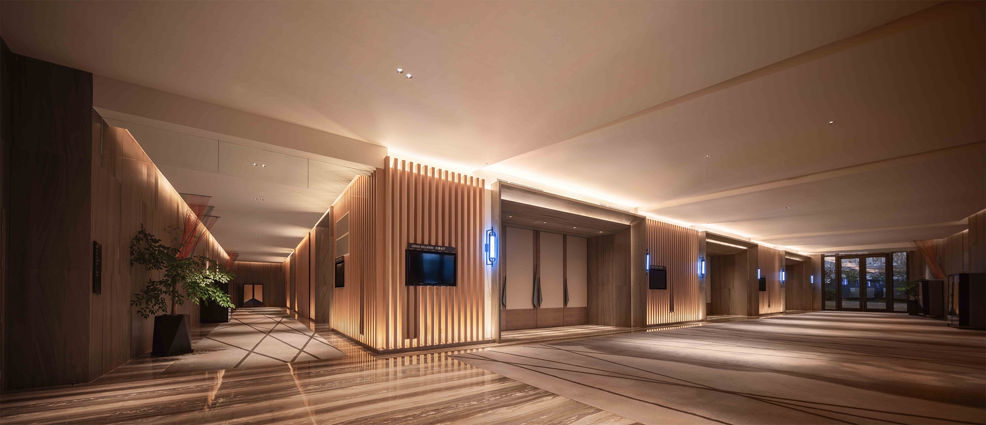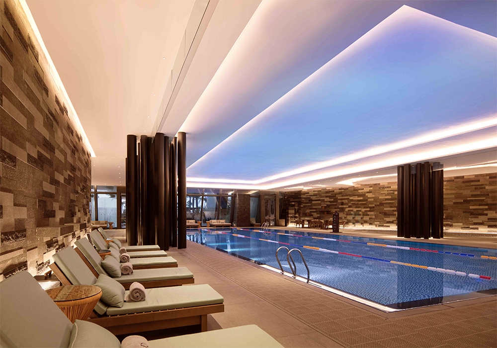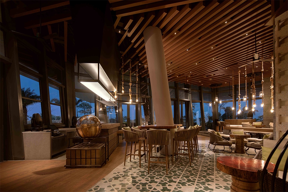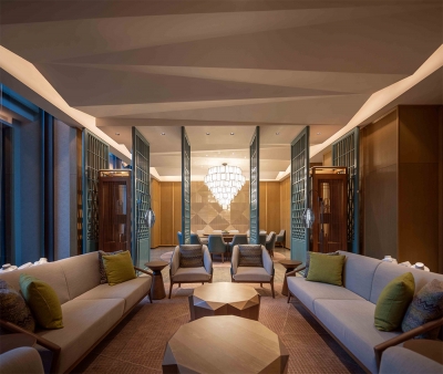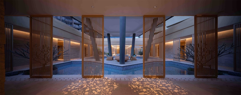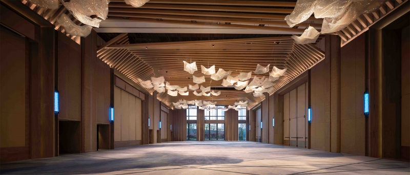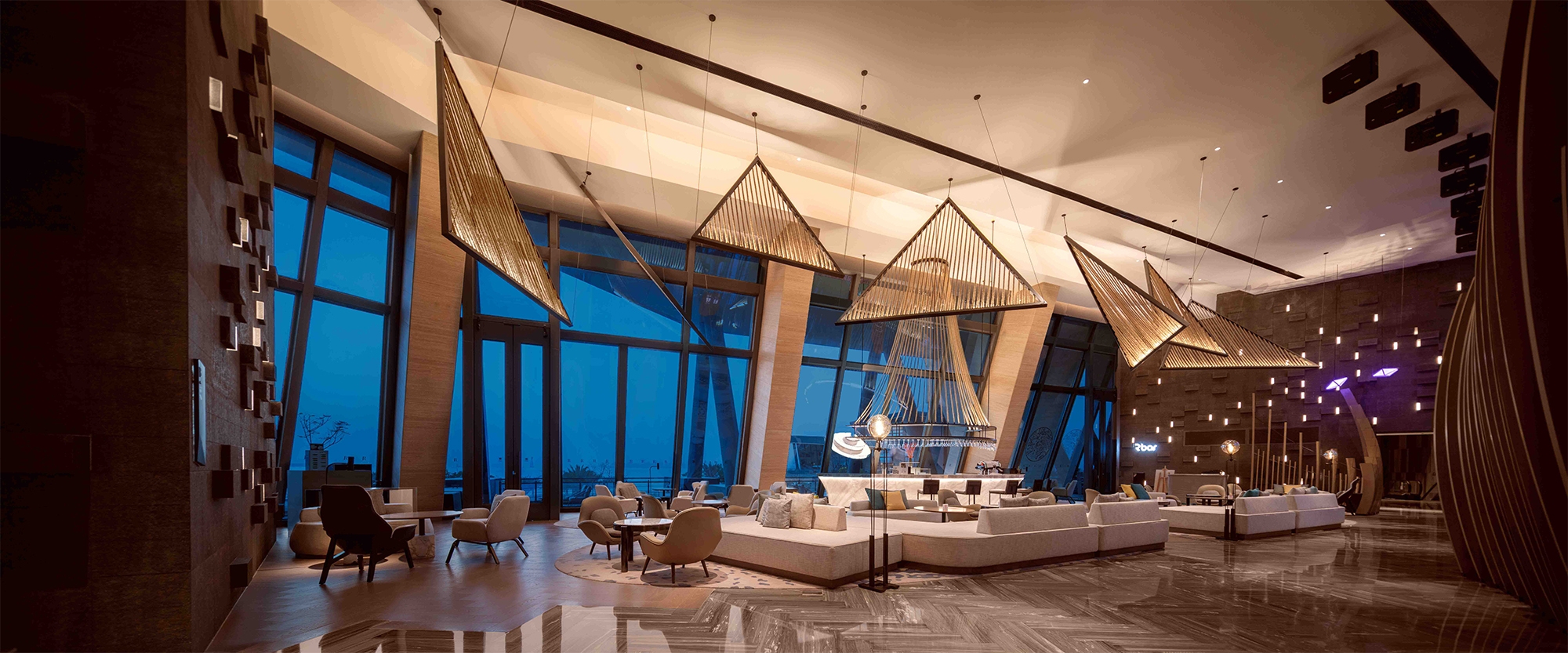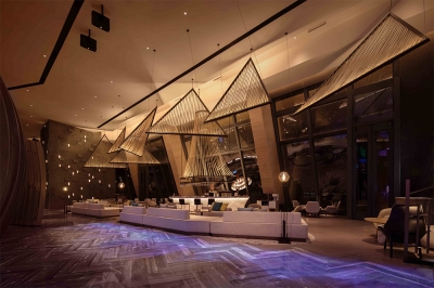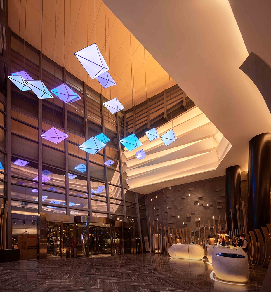 The concept was based on ships and sea breeze referring to the history of the main sea ports in china.The hanging kite shapes which also have rope rigging, appear to be floating above the lobby bar.The back wall has random wall lights to dim randomly and softly to look like a sea breeze flowing through the lobby.In the pool has two sets of small underwater uplights,the movement of the water creates ripple patterns on ceiling.Uplight were light blue and dark blue so the ripples colors create a two-tone depth.A feature light box detailed was developed to look like sunlight filtering through a tree canopy at all day dinning.The Chinese restaurant is classic with a clean and modern feel,the lighting was designed to be simple to compliment the interior design.Kids centre is a fun place and the lighting was designed to be comfortable and in balance with the interior design.Guestroom lighting is simple and light is used sparingly. We designed a small decorative box to project pattern on wall and ceiling and the projected pattern was designed to match the entrance wooden screen.