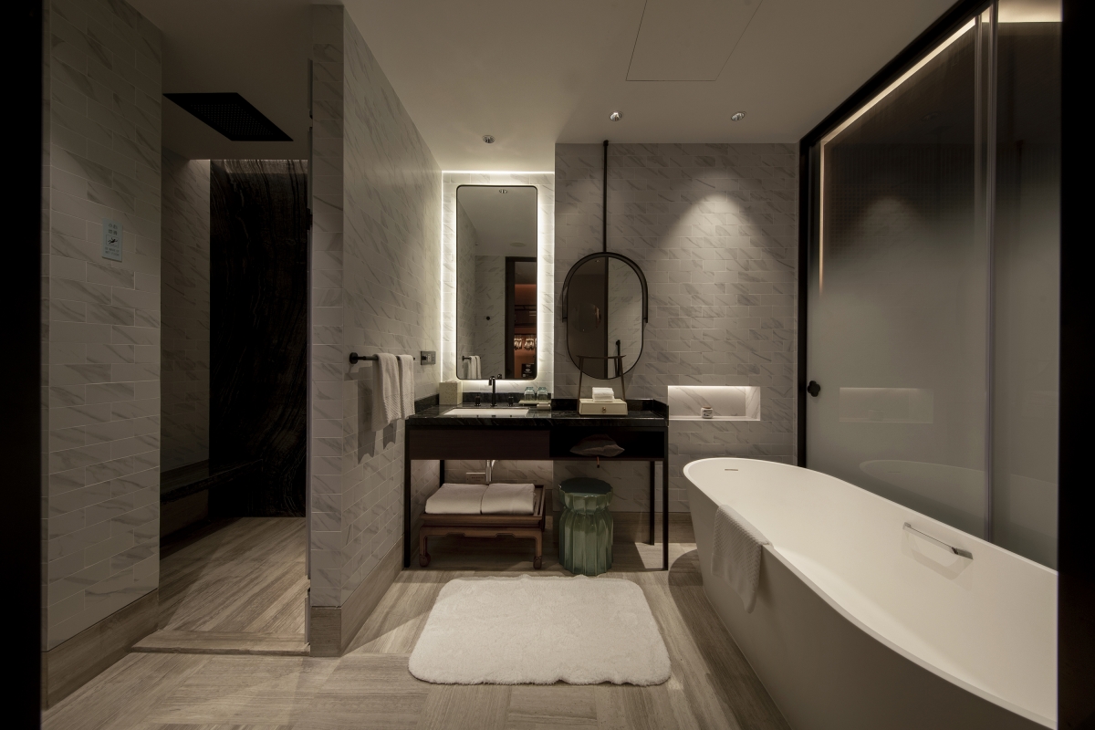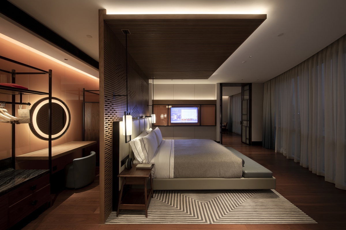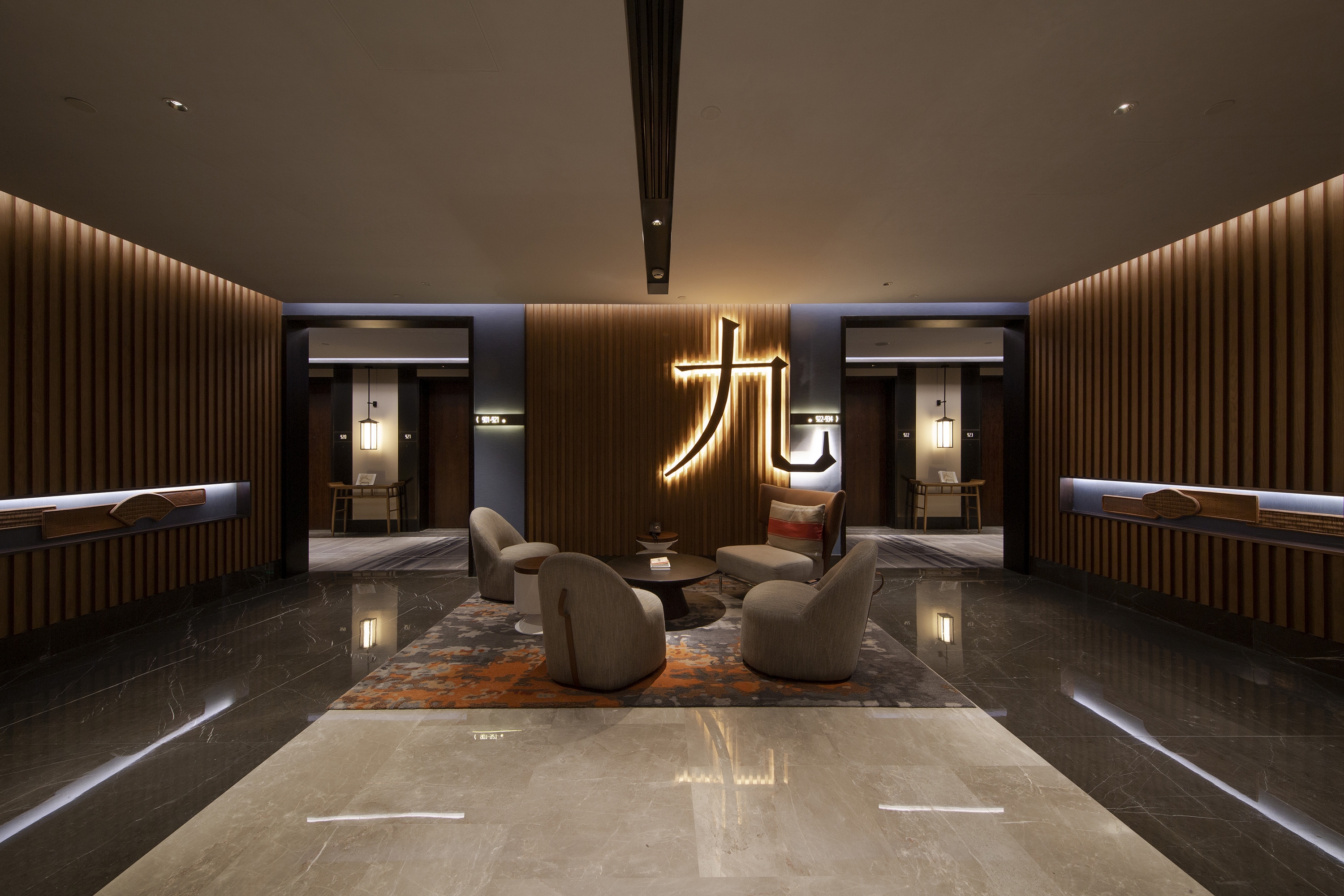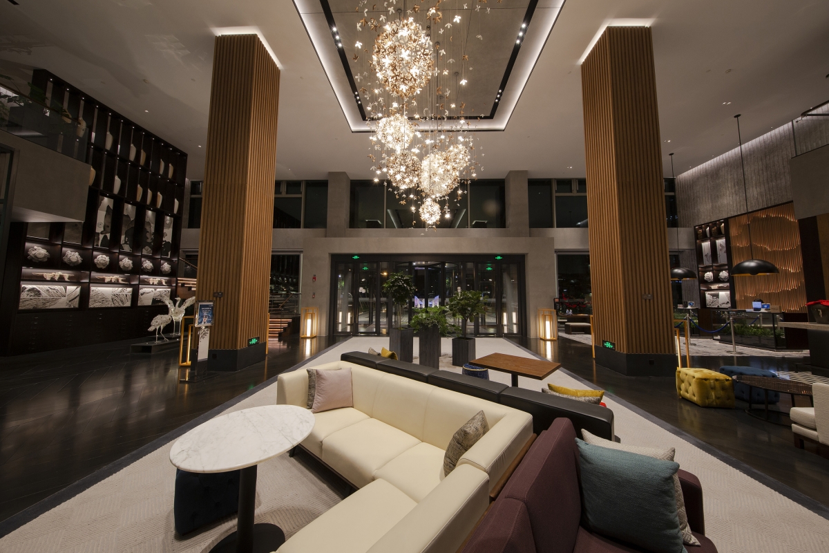 In the lobby, guests are welcomed by a pendant light surrounded by osmanthus, which is the city flower of Hangzhou. The flowers are like falling from the moon, making the hall glorious and bringing blessing to the guests. Behind the front desk, waves of the Qiantang river are revealed via hidden LEDs. Around the lobby, there are also herons light sculptures inspired by birds found at the Jinsha lake.