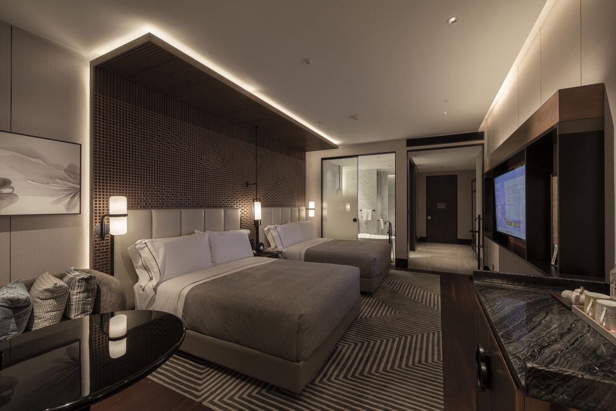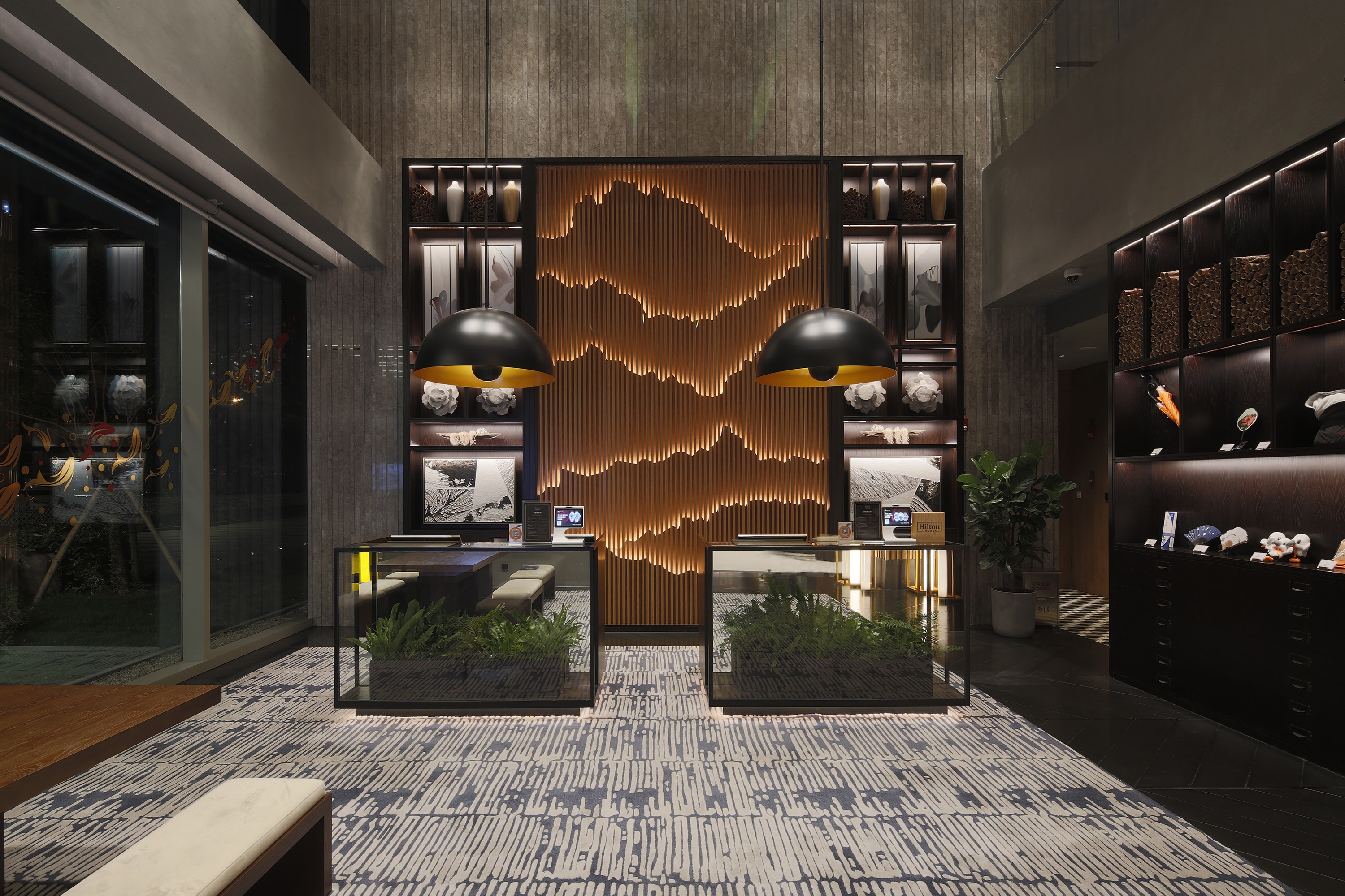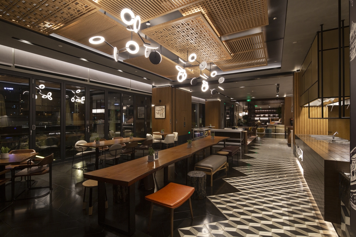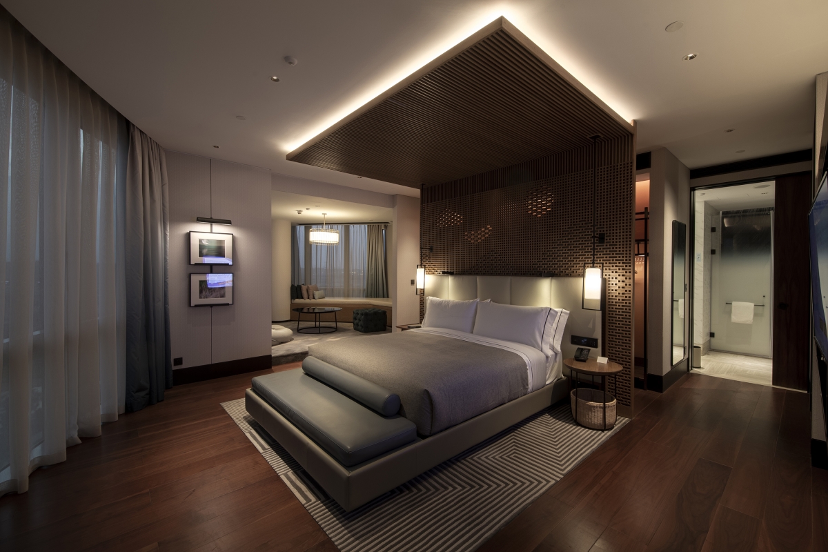 In the lobby, guests are welcomed by a pendant light surrounded by osmanthus, which is the city flower of Hangzhou. The flowers are like falling from the moon, making the hall glorious and bringing blessing to the guests. Behind the front desk, waves of the Qiantang river are revealed via hidden LEDs. Around the lobby, there are also herons light sculptures inspired by birds found at the Jinsha lake.