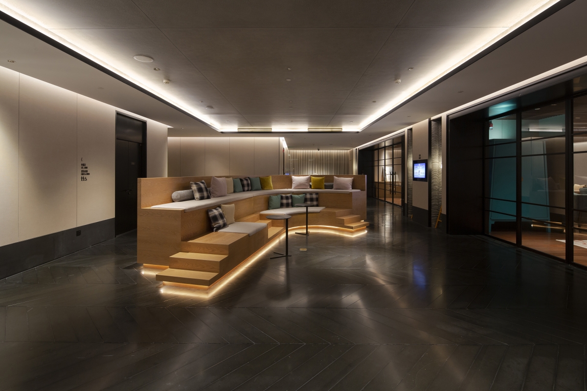 In the elevator lobby, an unmissable backlit floor number anchored on the wall reminds guests they arrived on the correct floor. It also separates the waiting area with its sofas from the corridor leading to the guest rooms.