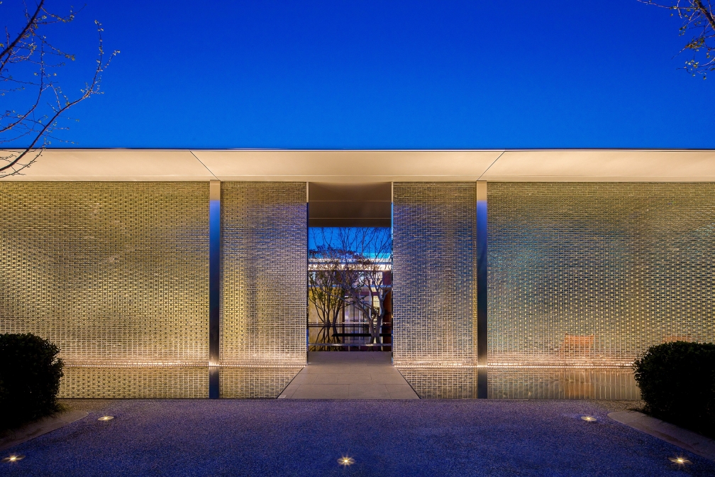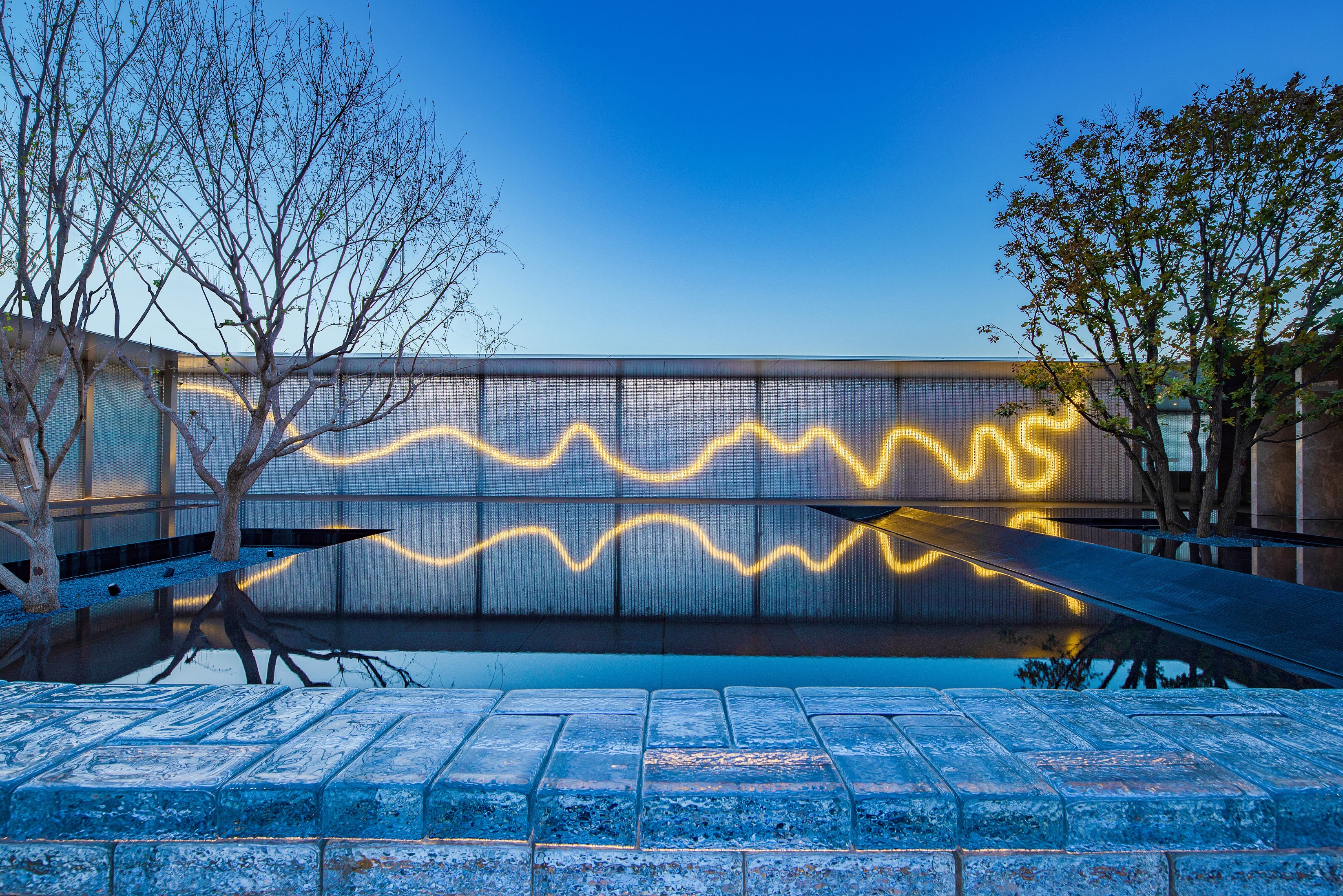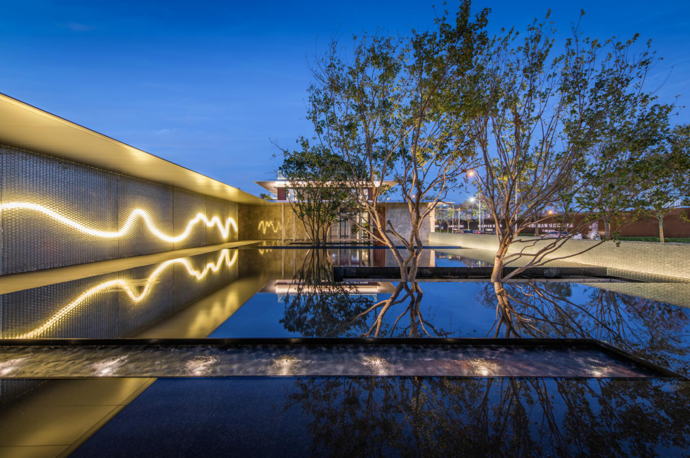 During nighttime, the glass brick wall can be used as the background of the garden or it will become a feature wall, an interactive lighting installation which is consisted of glass bricks and a led mesh screen. The topic of ‘Mei River Into The Sea’ is presented in front of all visitors. The combination of Chinese brush looking wave line and its reflected image make an interesting picture.
