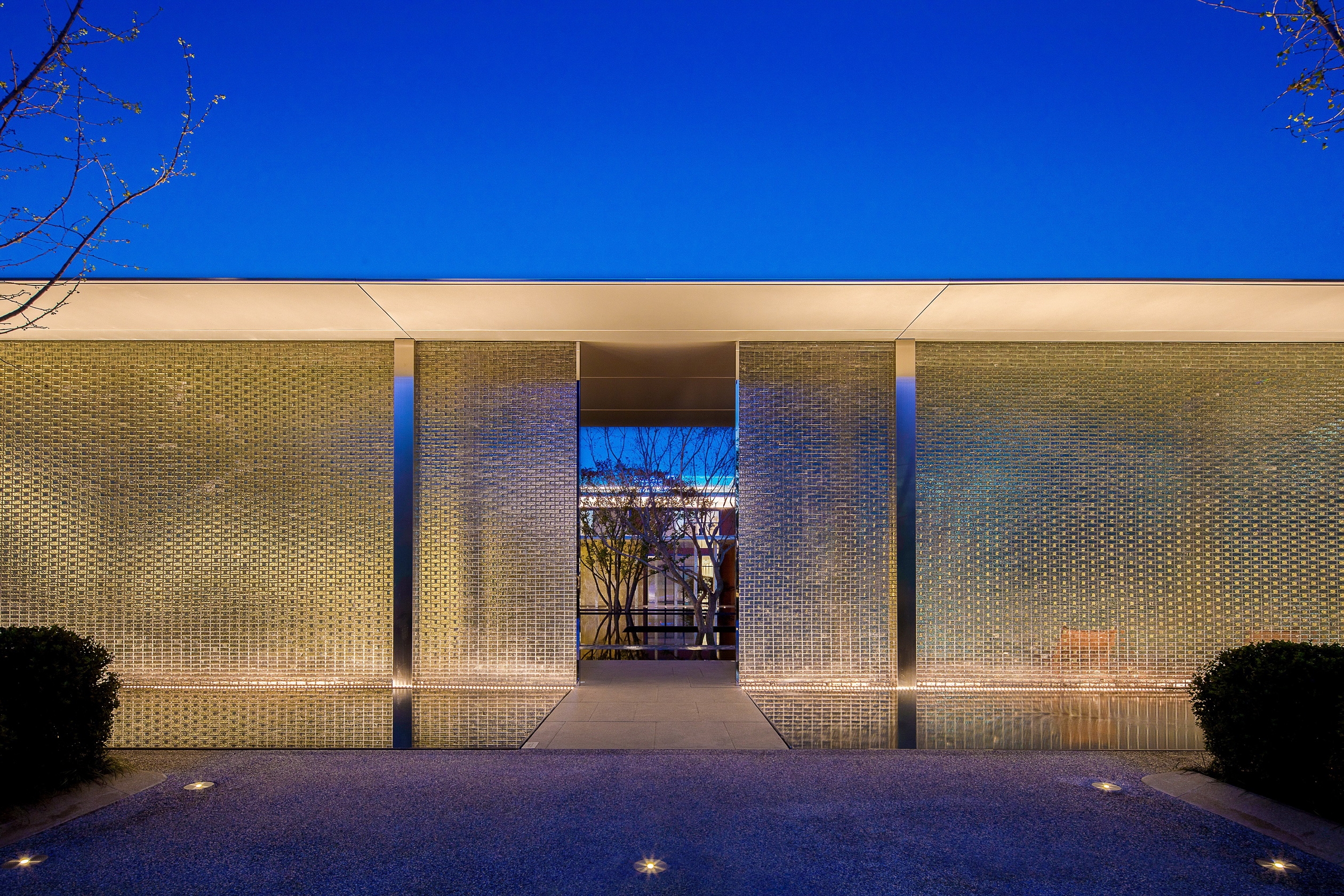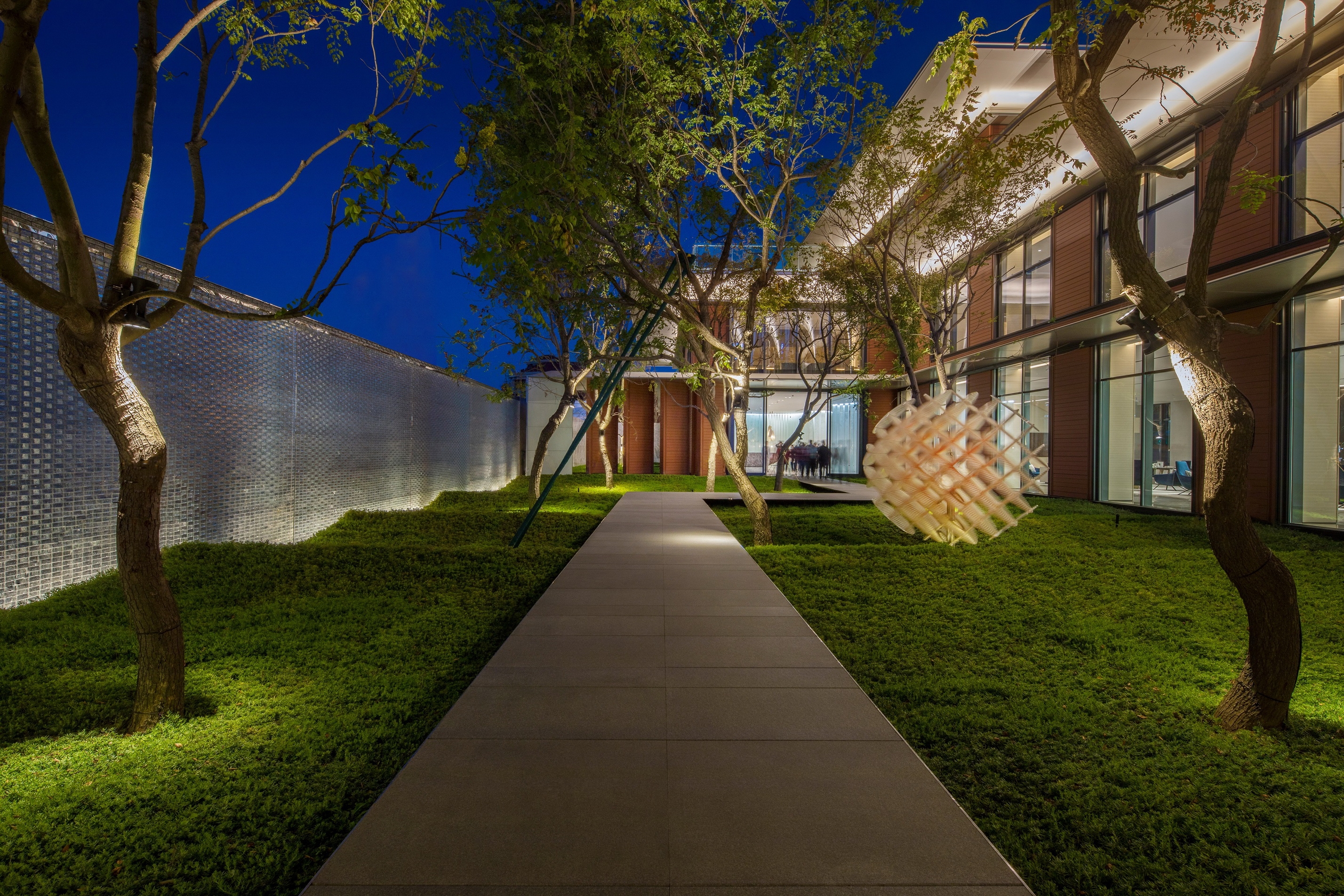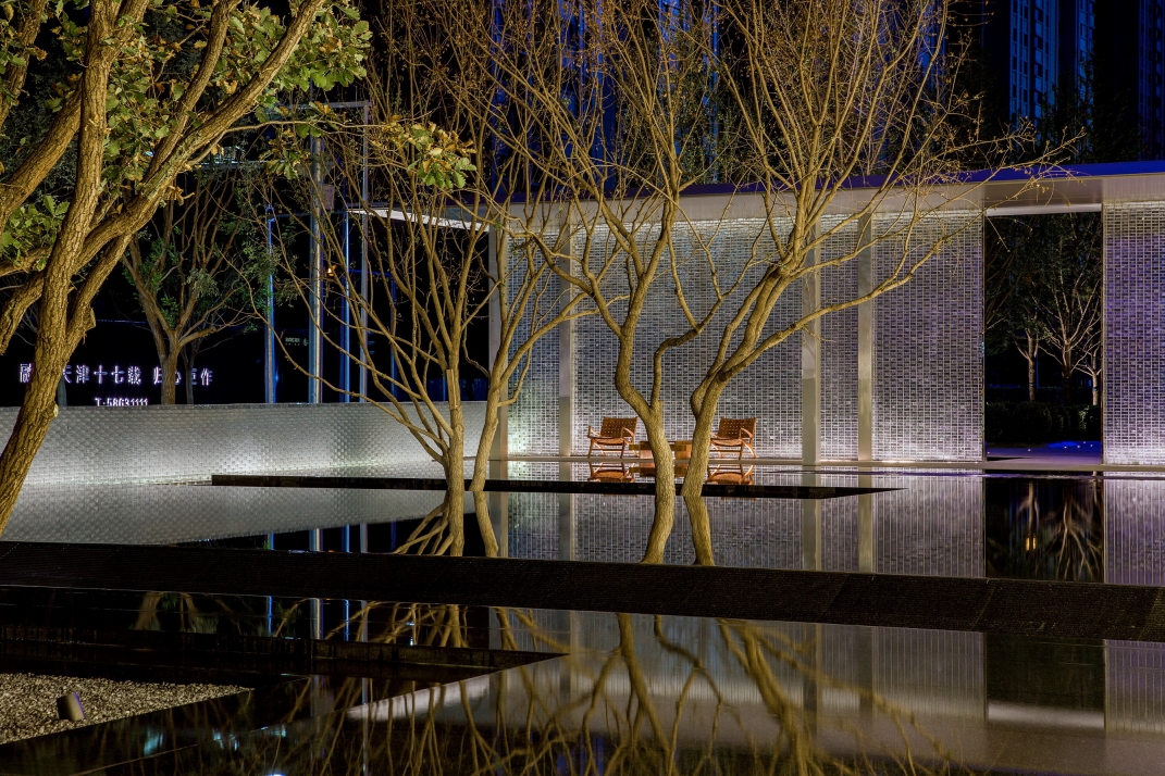 The garden is surrounding by a long corridor. The trees located on the reflecting pool are lit by the 3000K color temperature in-ground fixtures. The trees are reflected by the pool to create the focal point of the garden.