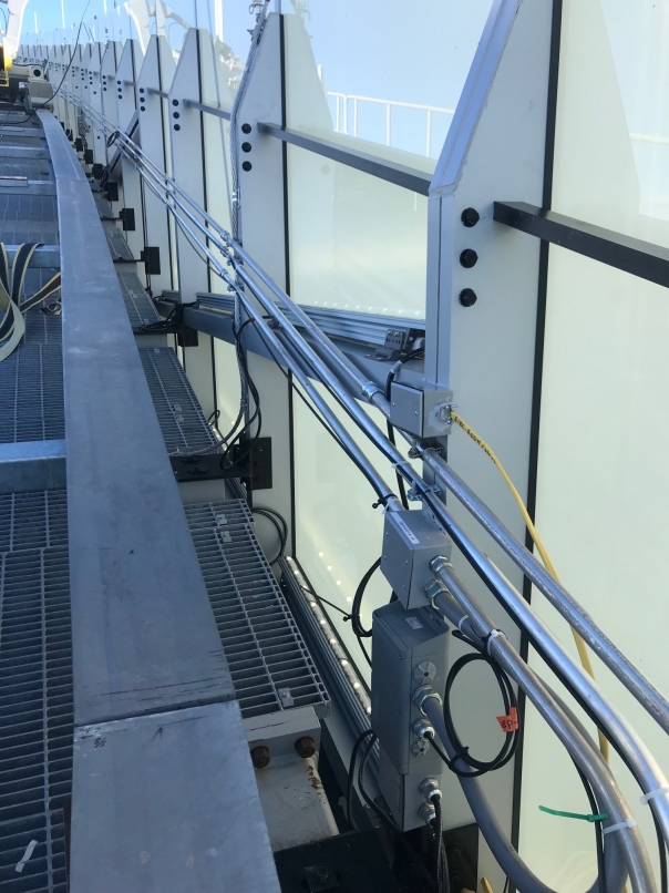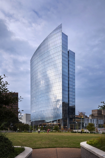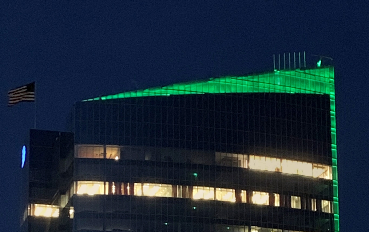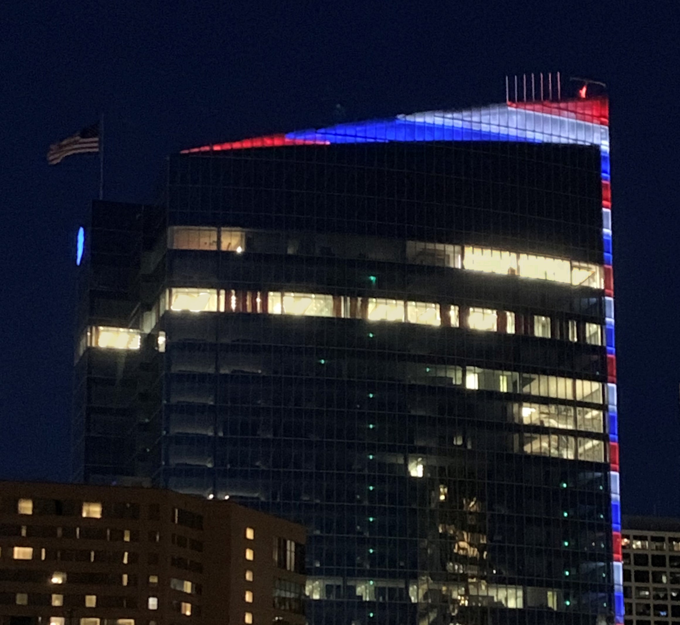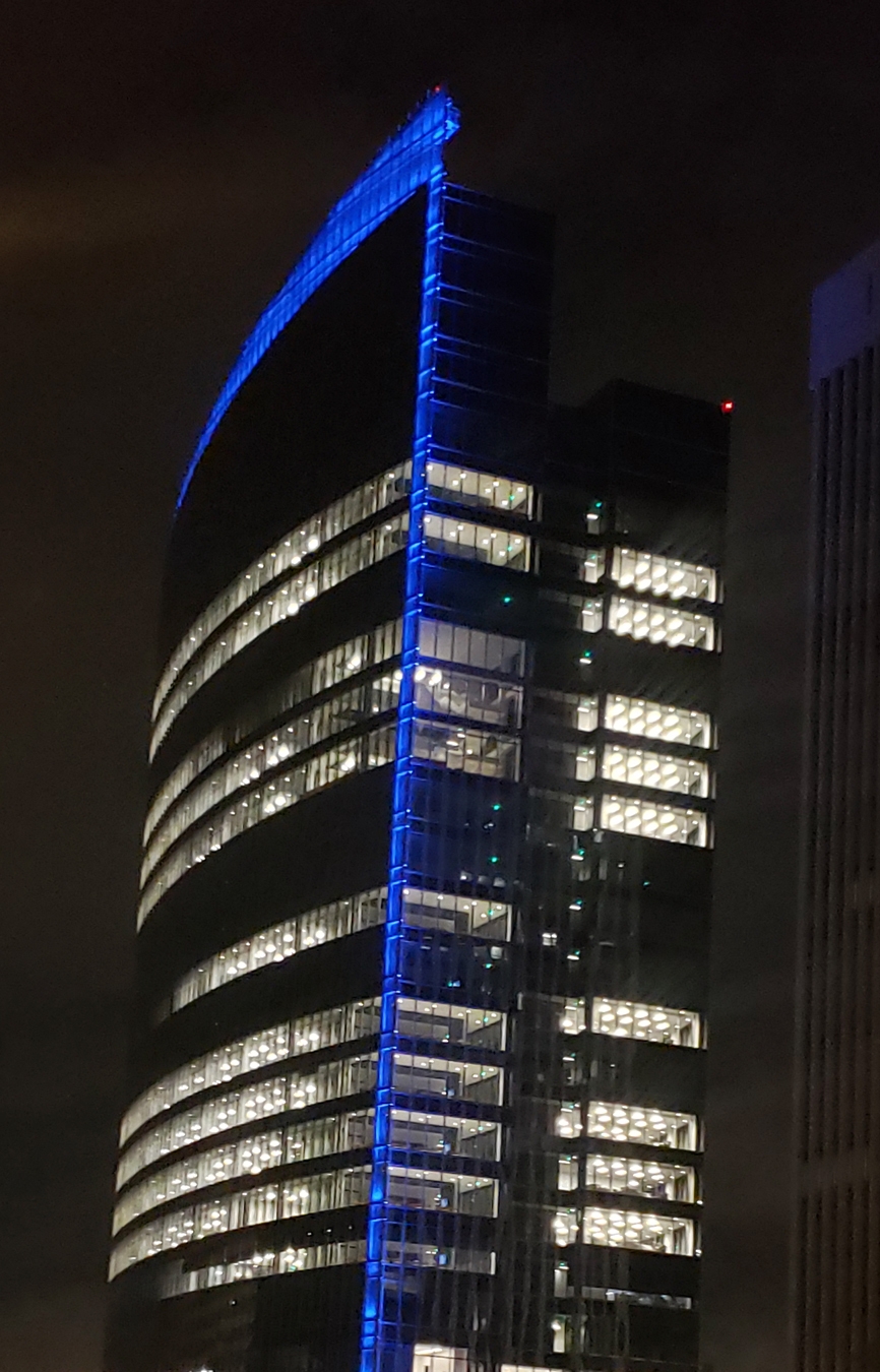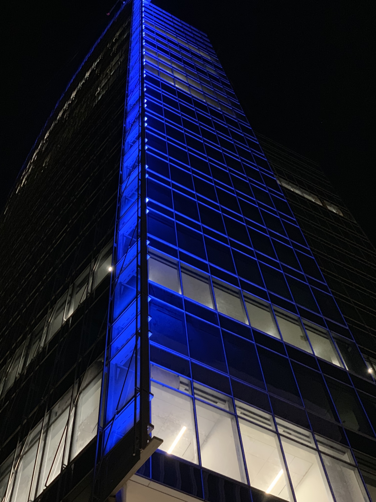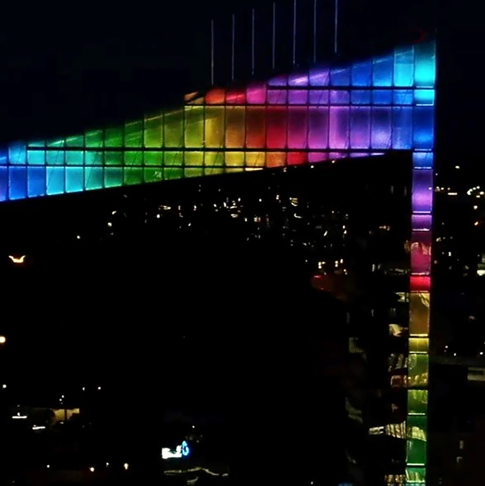 By day, the tower presents itself as a solid glass, curtainwalled building. In reality, thin structures that are extensions of this curtainwall reach beyond the building, forming a crown and vertical wing wall that our lighting render visible only at night. RGBW light strips, mounted on mullions at the roof and along custom shelves of the wing wall, make these elements glow. DMX controls allow color choices and animation.